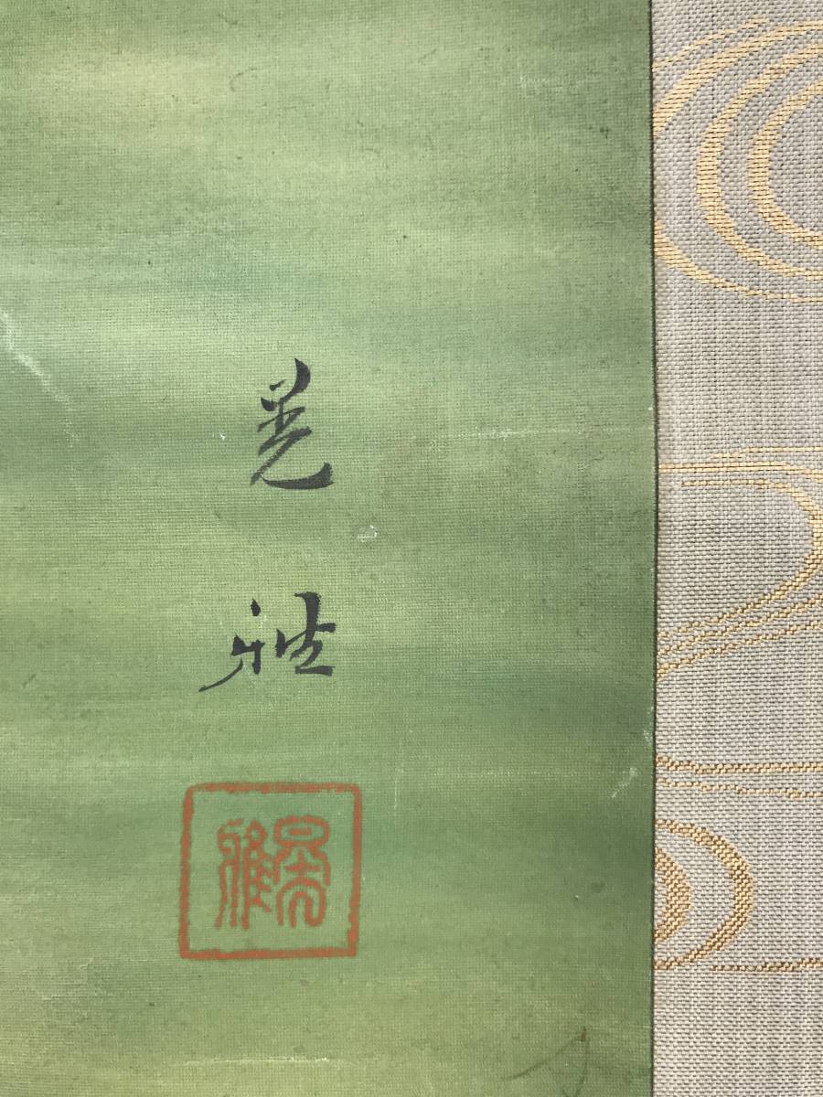 【作品状態】 本紙は絹本肉筆です。本紙は多少の時代感あります。表装は薄汚れ、天地に汚れシミ、時代ヤケによる色ムラ、糊シミなどあります。
