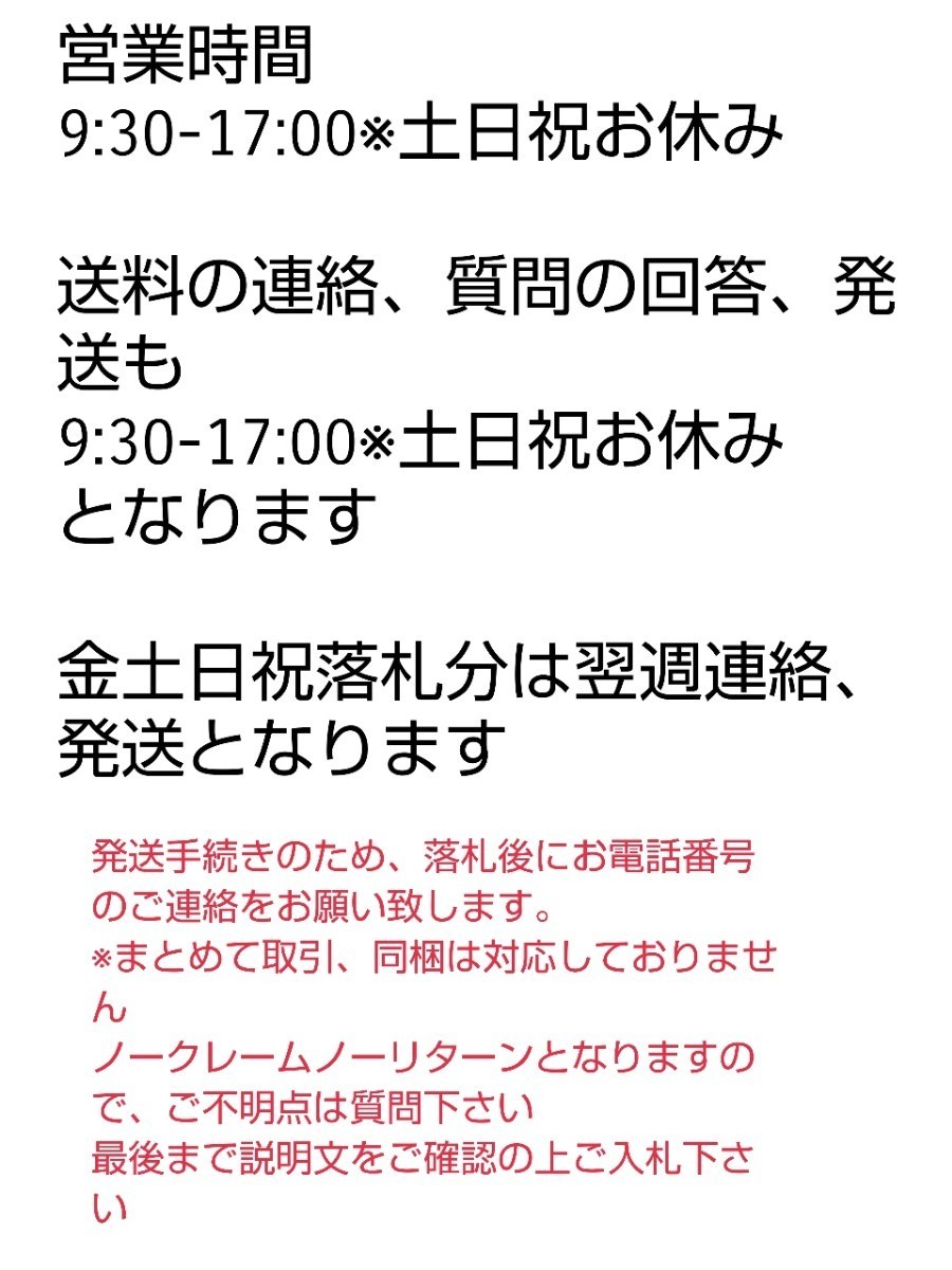 質問の回答、送料の連絡、発送は月~金9:30-17:00※日祝お休み となります。
