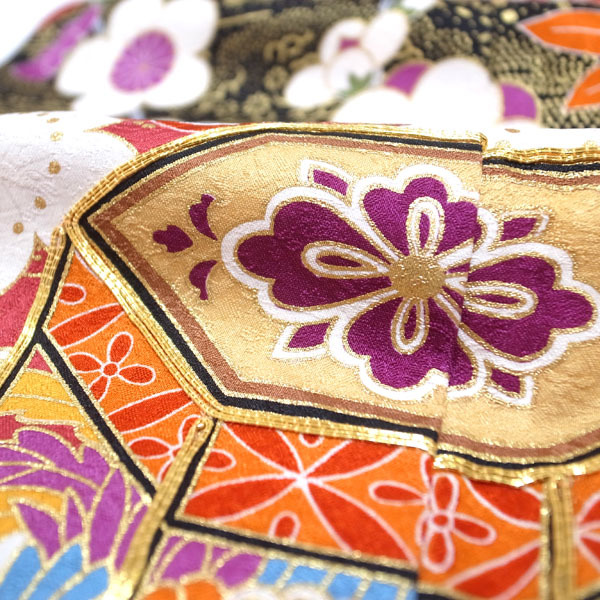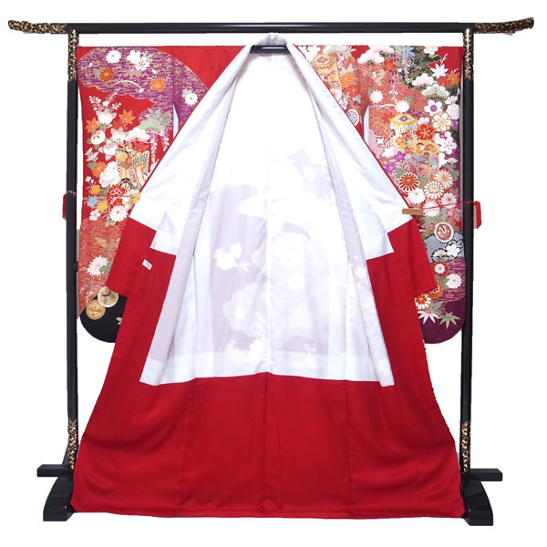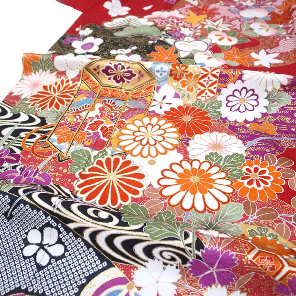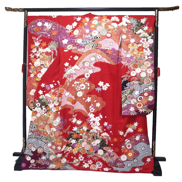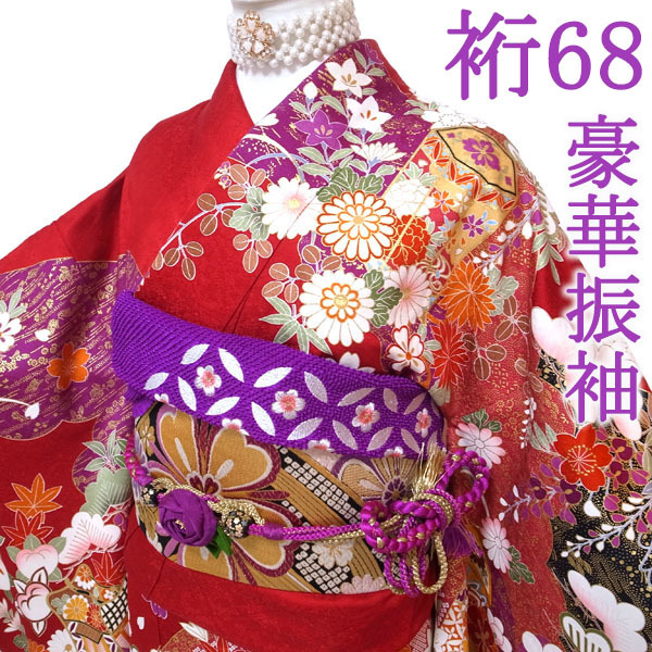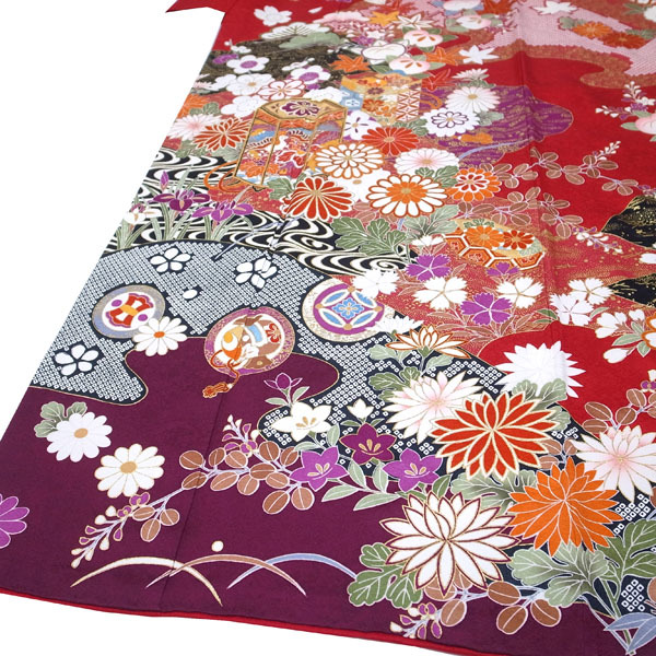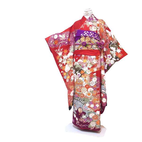振袖 着物 袷 赤 レッド 金彩加工 金駒刺繍 地紋 松竹梅 菊 桜 御所車 宝尽くし 成人式 成人 結婚式 結婚 お祝い リユース リサイクル 正絹 絹 上質 オシャレ おしゃれ お洒落 レディース 女性 女物 女 和服 和装 なごみ 身丈170.5 裄68 Lサイズ 中古 仕立て上がり品 sn1046