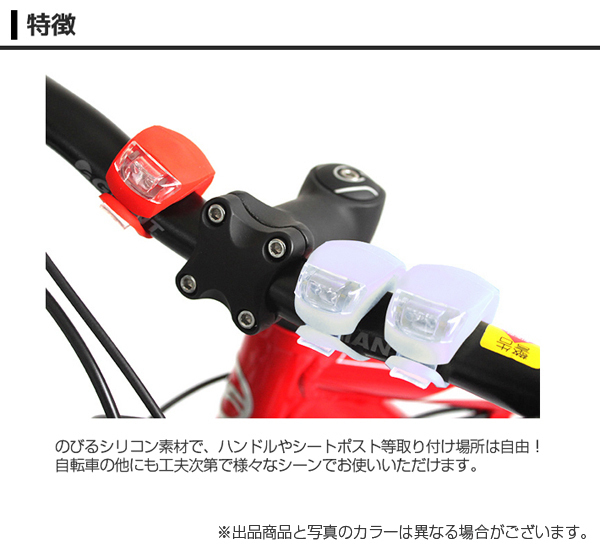 | 商品説明 | ボディにシリコンラバーを採用し、 自転車のハンドルアーム・シートポスト・フレーム等に巻いて固定するだけで取り付け可能。 犬の散歩やウォーキングにもお使いいただけます。 本体上部にある埋め込み型スイッチで点灯します。また、点灯・高速点滅・通常点滅の3段階に切り替えできます。 軽量で防水性があり、電池の交換もカンタン。 シリコンLEDライト2個セットの商品です。 |