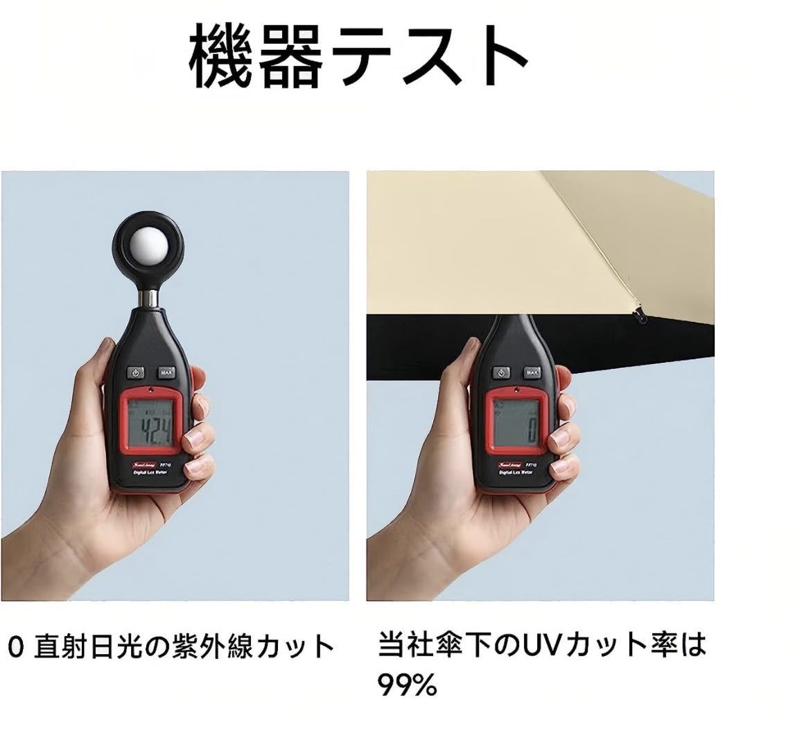 UVカット率99%、UPF50+の最高値を取得。 盛夏の強い日差しからあなたを守ります。100%完全遮光 ,生地自体に黒い遮熱コーディング加工で、紫外線からお肌を守ります。特に夏には、日差しは強くなくても紫外線は強いので、ぜひこの傘をお使い、綺麗なお肌を紫外線から守りましょう!