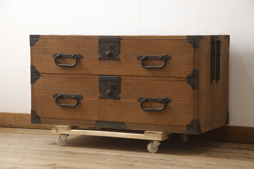 和製アンティーク 明治期 上手物!! 分厚い金具が目を引く上質な造りの総桐会津箪笥ローボード(総桐箪笥、総桐たんす、時代箪笥、和タンス、ローチェスト、引き出し)(R-066135)