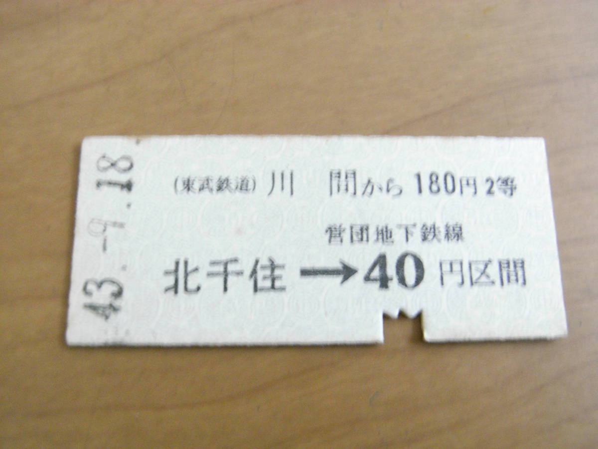 東武鉄道営団連絡乗車券 川間から180円2等 北千住→営団地下鉄線40円区間 昭和43年7月18日 川間駅発行