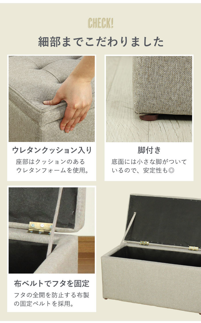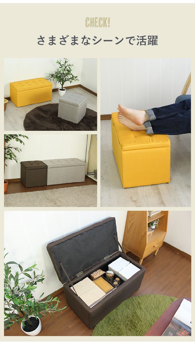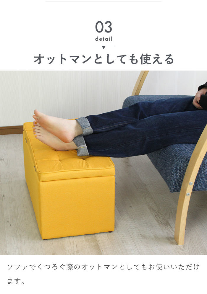 | 「座る」と「しまう」が一つになった収納ベンチ。 座面の下は収納スペースになっているので、散らかる小物類や本、CD・DVDなどの収納に最適。 どんなお部屋にも馴染むシンプルなデザインなので、リビングだけでなく、玄関先やちょっとしたスペースに置いてもおしゃれな印象に。 色違いを交互に並べてみたり、同シリーズのシングルタイプと合わせてみたり、自分好みのアレンジでお部屋のアクセントになるインテリアとしても大活躍。 |