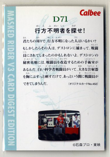 | ◆防水対策 厚紙補強 カルビー 仮面ライダーV3チップスカード(2004 復刻版) D71 行方不明者を探せ! トレカ 即決 | |