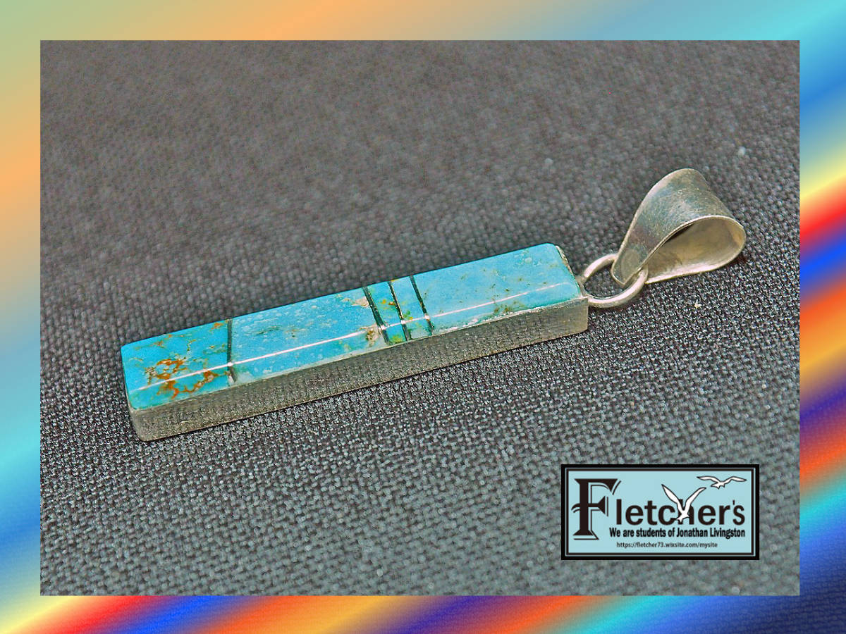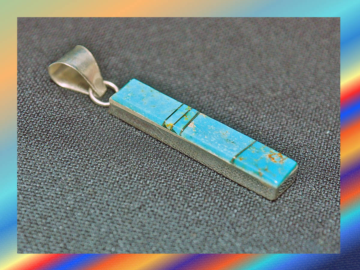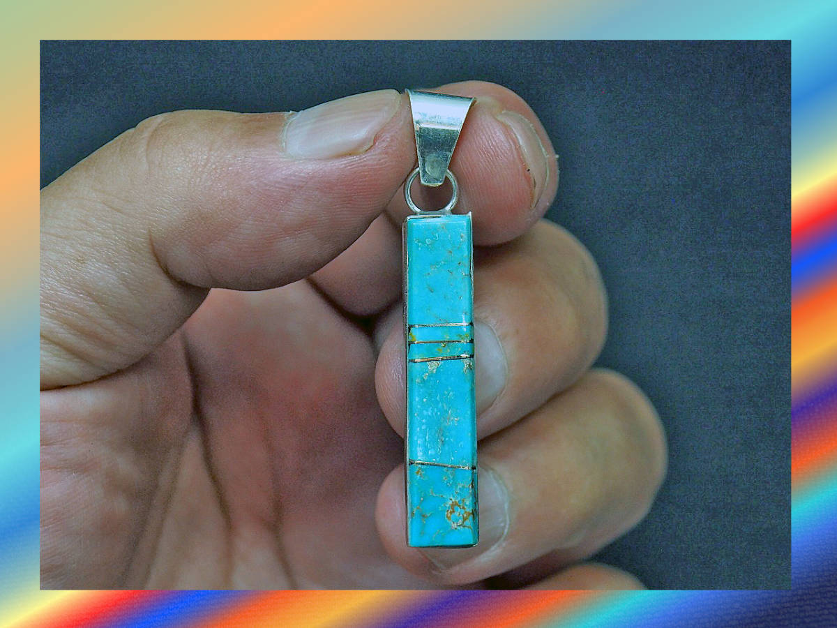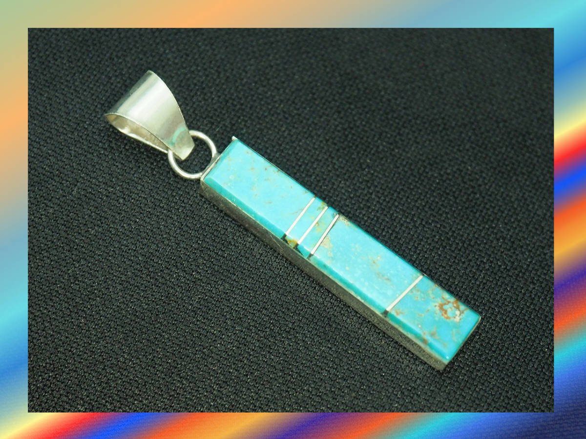 質感のあるスターリングシルバーの地金に、画像のとおり、上物のキングマン鉱山産出のターコイズ、しかもハニーウェッブの入った物を細密にカットして埋め込んだ大変美しいペンダントです。