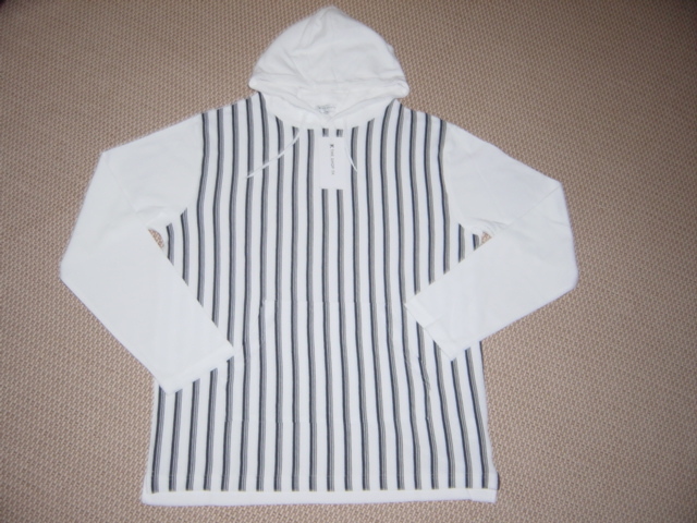 新品未使用のタケオキクチストライプパーカーです。カラーはホワイト×ブラック、フロントマルチストライプデザインです。サイズはXL、丈約71cm 肩幅約47cm 袖丈約63cmです。