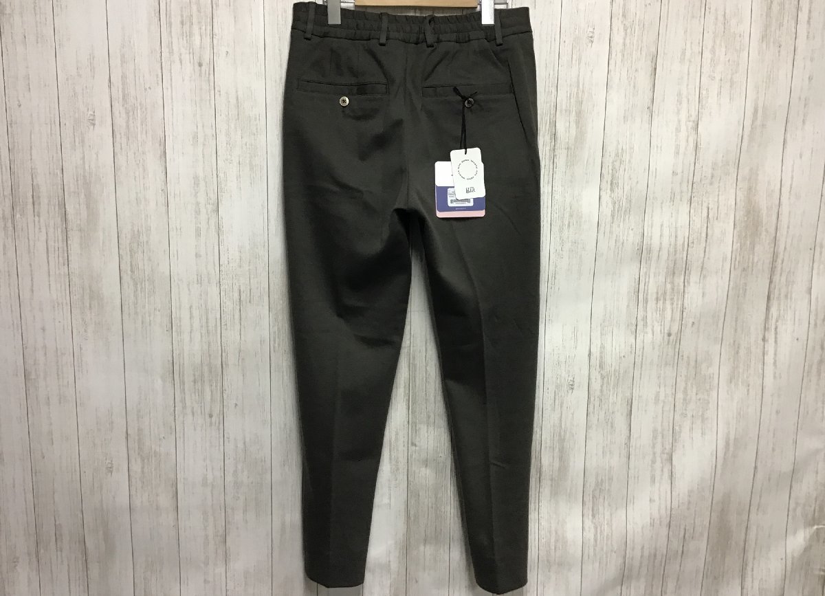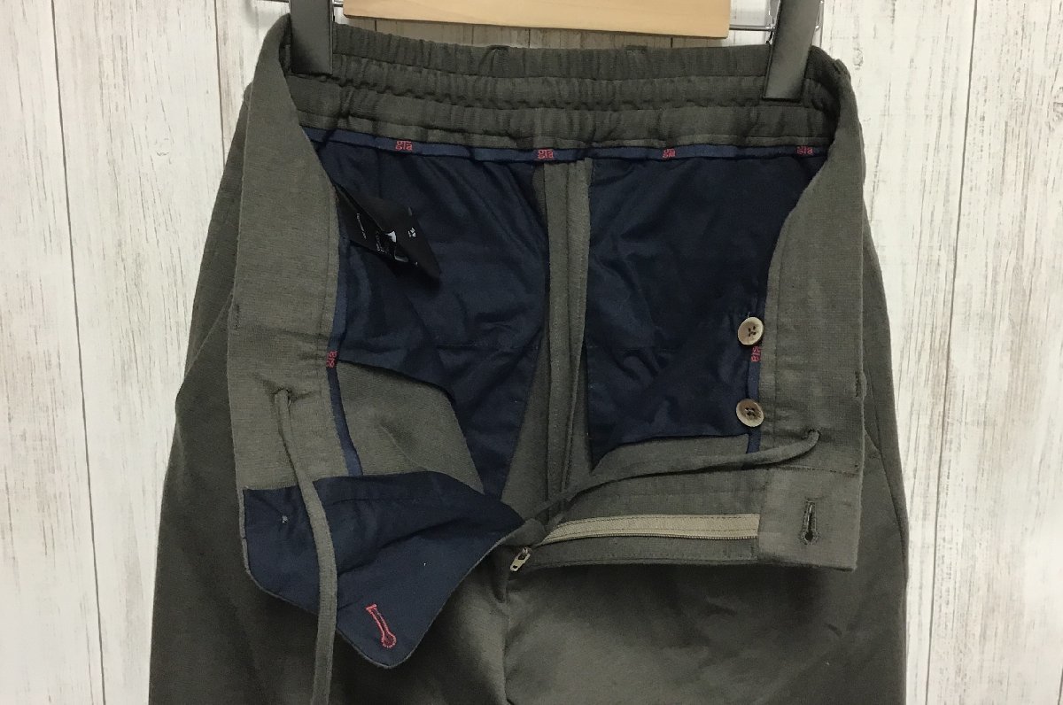 ヒップらか膝にかけてリラックス感のあるシルエットに、キツすぎないテーパードが大人の上品さを香らせています。腰回りは後ろ半分のみゴム仕様になっており、ドローコードも内側に施されています。その為、トップスをインした時に正面から見ればゴムが見えず、カジュアルになり過ぎないスタイリングを作り上げてくれます。