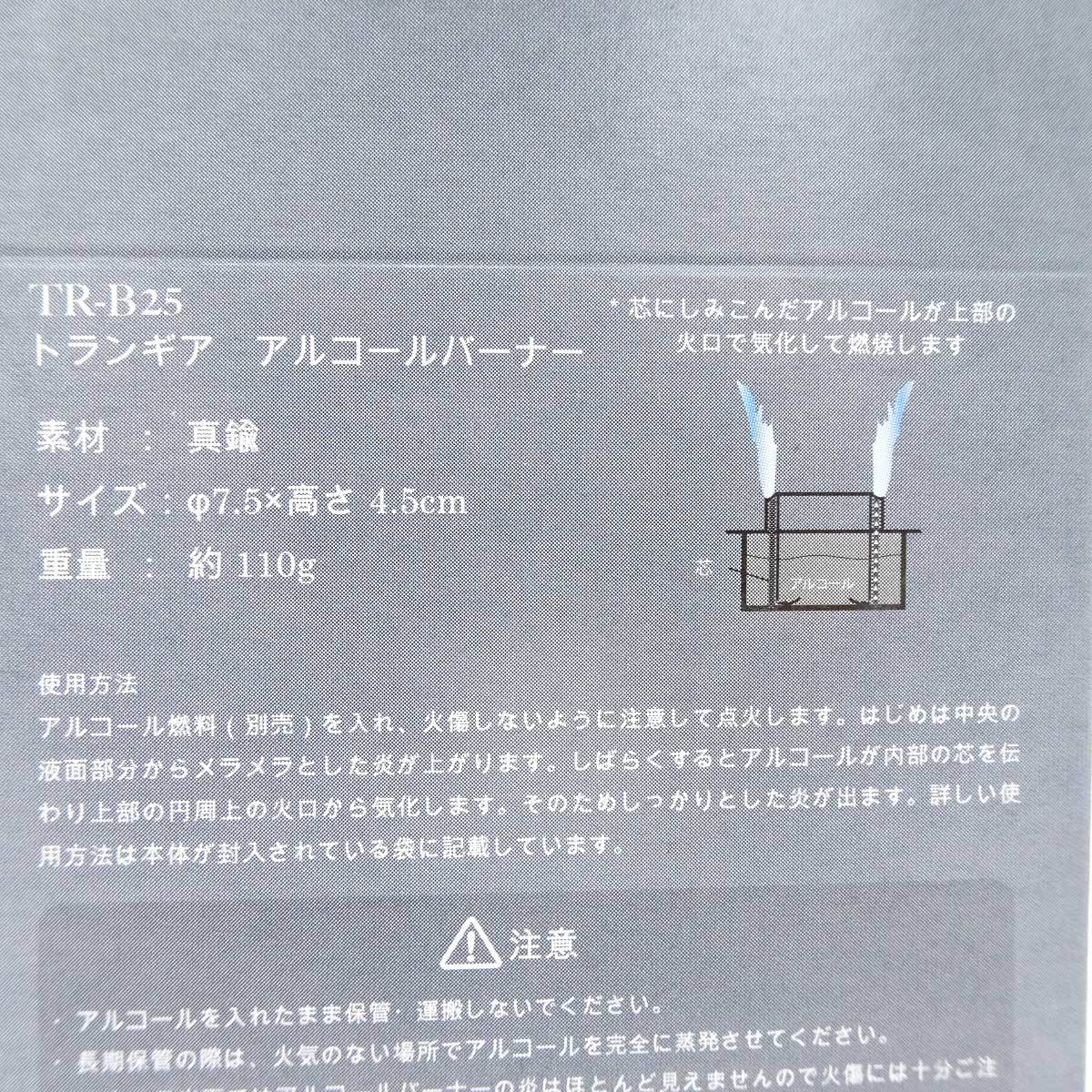 ※商品は画像にあるものがすべてとなります。 【仕様】 ブランド:トランギア タイプ:アルコールバーナー スピリットバーナー [ウィンドシールドゴトク(TR-281)付] 型番:TR-B25 重量:110g 収納時サイズ:径7.5×高さ4.5cm 材質:真鍮 |