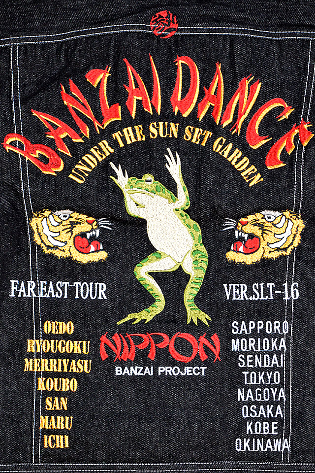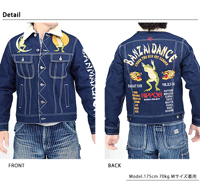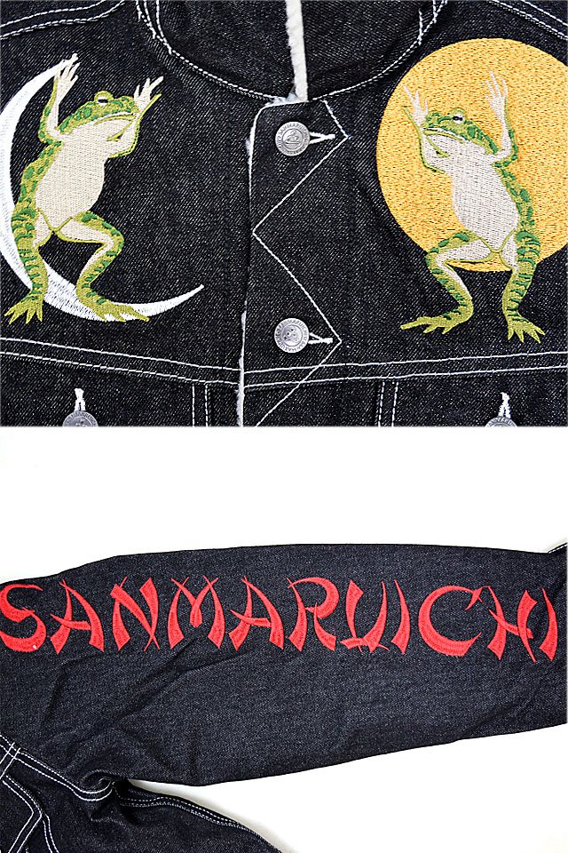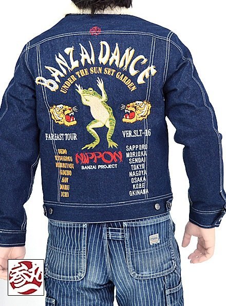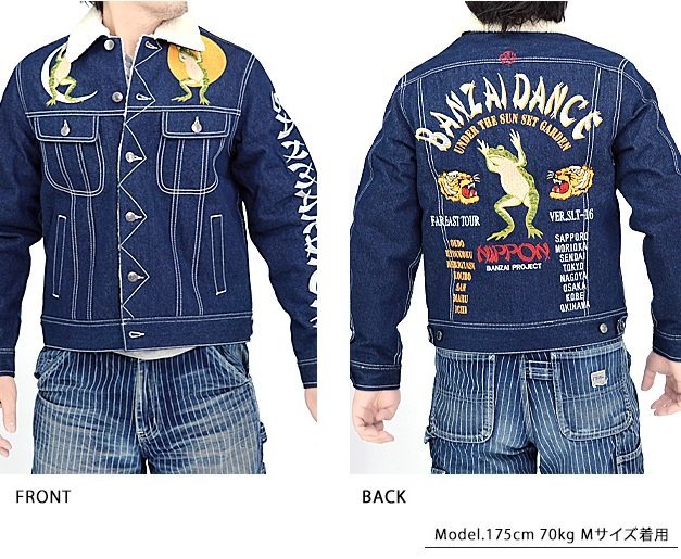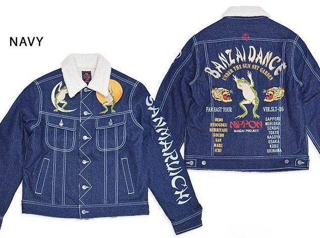 「参丸一」さんから「万歳デニムボアジャケット(SOU-50039)」のご紹介です。 襟元にボアを切り替えた、寒い季節にぴったりのアウターが登場しました! ボディーにはデニム生地を採用し、カジュアルな仕上がりに。 フロント両肩と背中には万歳する蛙の立ち姿を刺繍で落とし込みました。 虎や英字ロゴを組み合わせ、和洋折衷なデザインをお楽しみ頂けます。 左袖にはブランドロゴをライン状に刺繍しました。 両胸にはフラップ付きのポケットを、両身頃には斜めポケットをそれぞれ配置。 ボタンにはブランドロゴが刻印されており、細かいところにまで拘り、作りこまれた逸品です。 裏地にはボアを張り巡らせ、さらに中綿も詰め込んだ、防寒性にも優れたアウターです。 | |||||||||||||||||||||||||