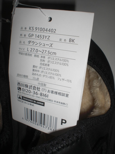 | 西川ダウン ダウンシューズ 羽毛入りシューズ スリッポン KS 91004402 カラー ブラック 素材 ポリエステル アウトソール ゴム底 詰め物 ホワイトダックダウン85% フェザー15% サイズ L(27-27.5cm) 仕様 毛布でも使用されているシープボア生地でふわふわあったか。軽量 両足で約450グラム。西川正規品 ウォッチリストに追加 | |