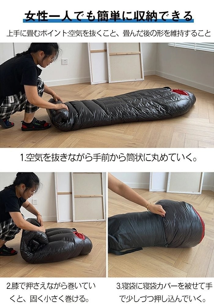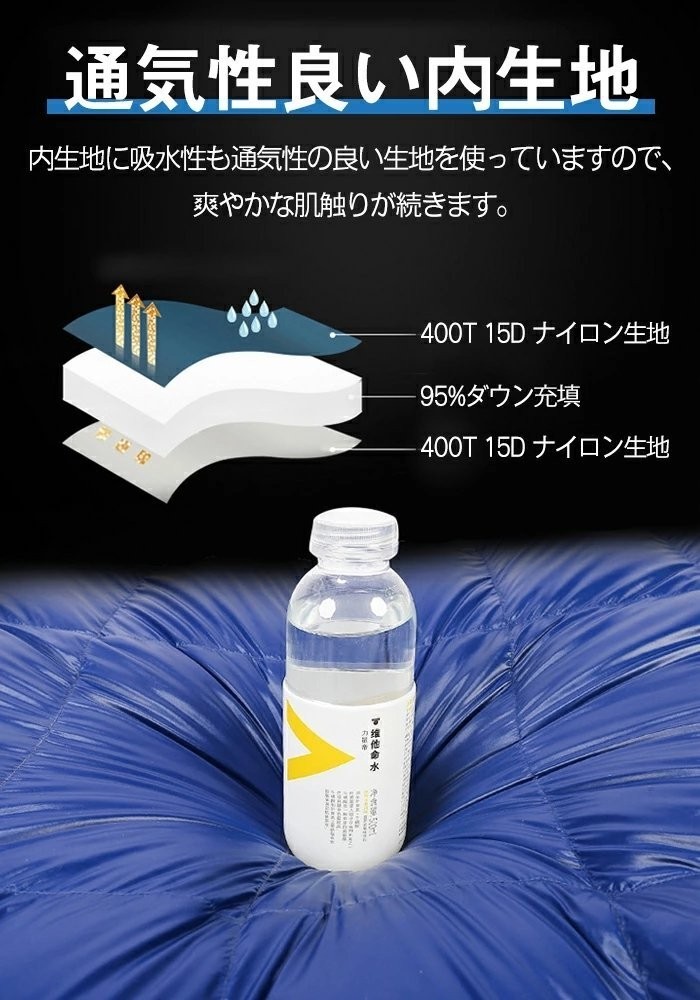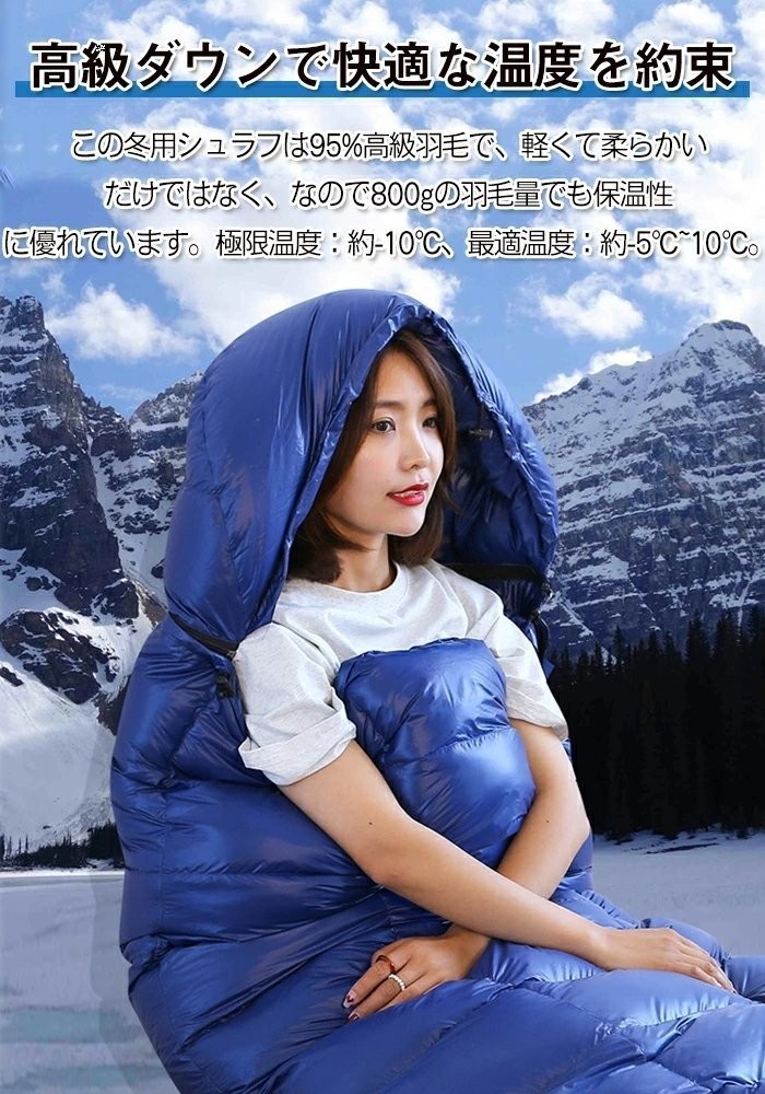 【高品質ダウン充填】ふわふわで軽くてやわらかいナチュラルダックダウンを使用し、800gの羽毛を詰めても、この寝袋は優れた暖かさを保証し、大きな膨張と軽くて柔らかい感触を備えています。寝袋快適な使用温度:-5℃~10℃、最低使用温度:-10℃。(注:本商品は収納のため極限圧縮されたので、開封後は薄く見えますが、約1時間換気するとふわふわになります。