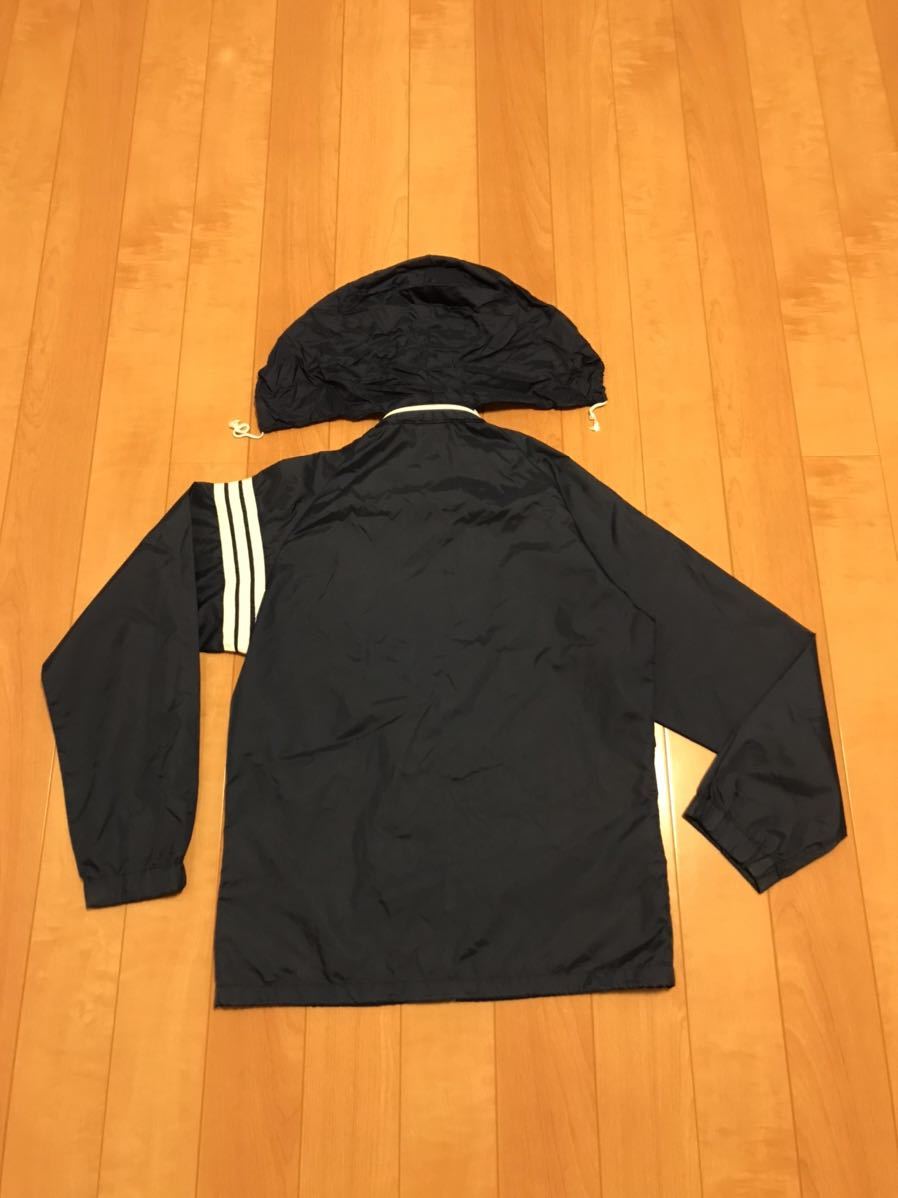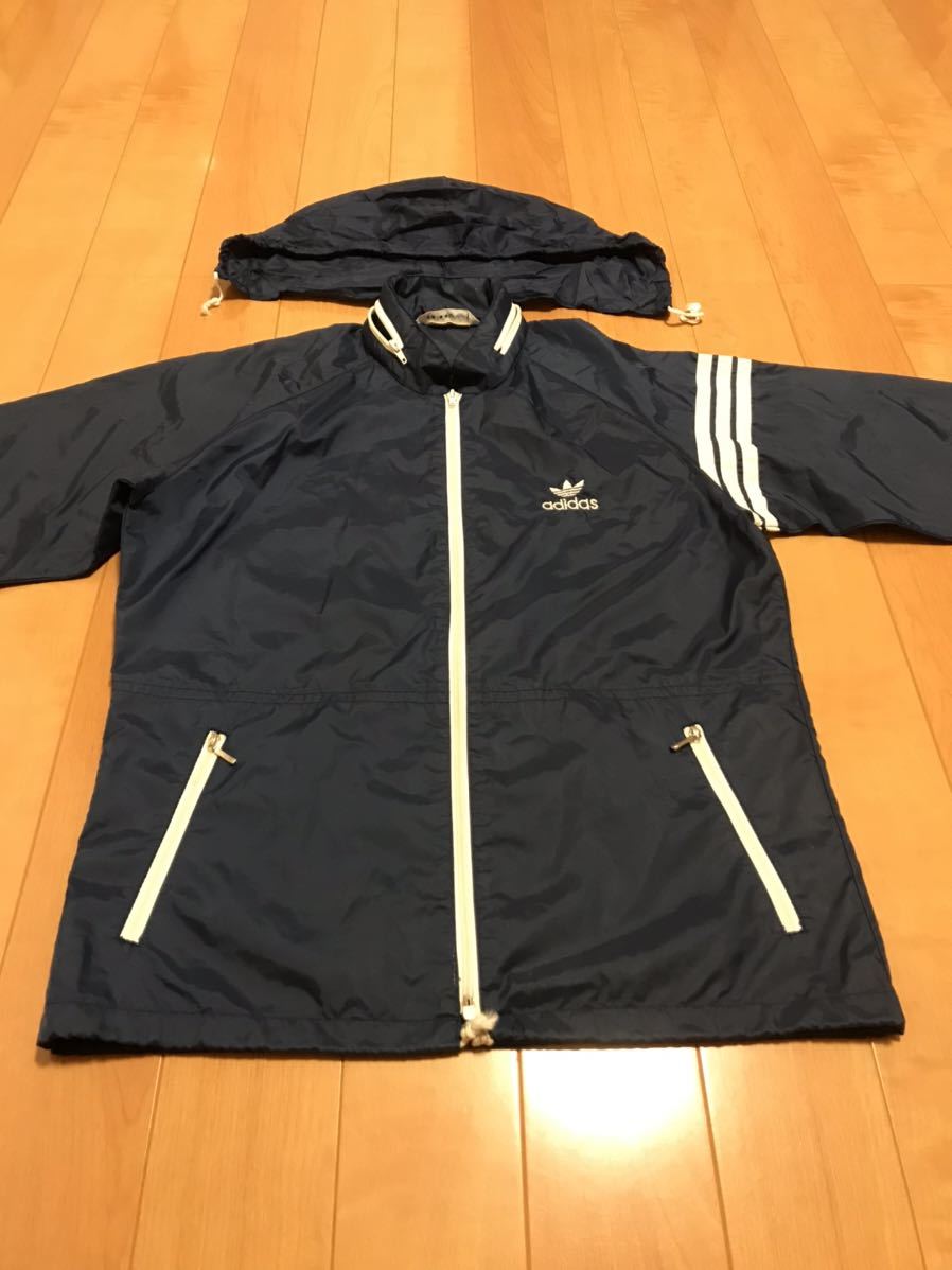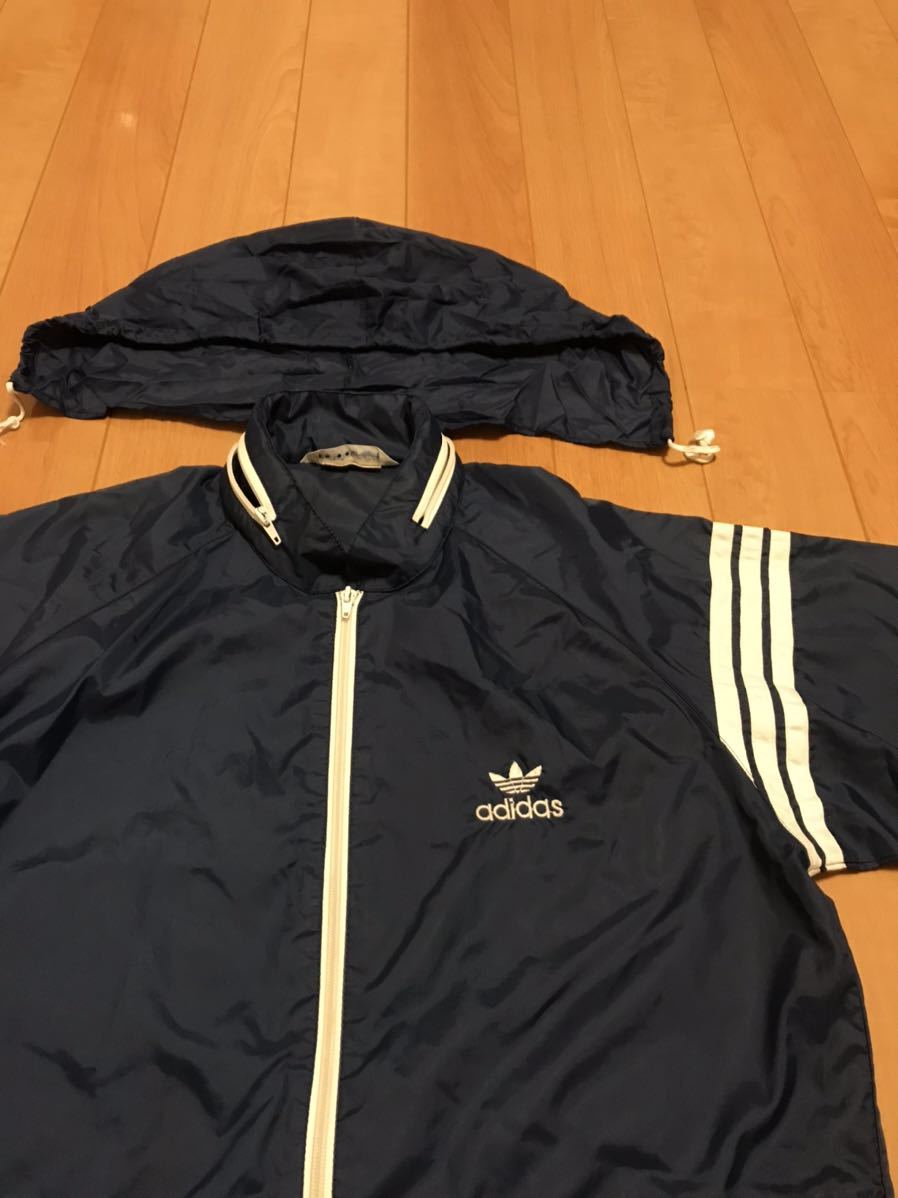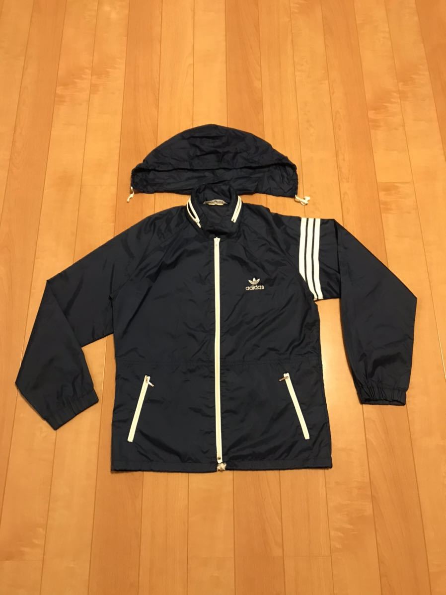 良品☆デサント/80s adidas・アディダス サイズM ビンテージ フード収納式フルジップ薄手ナイロンジャケット OLD三つ葉ロゴ刺繍ジャージ