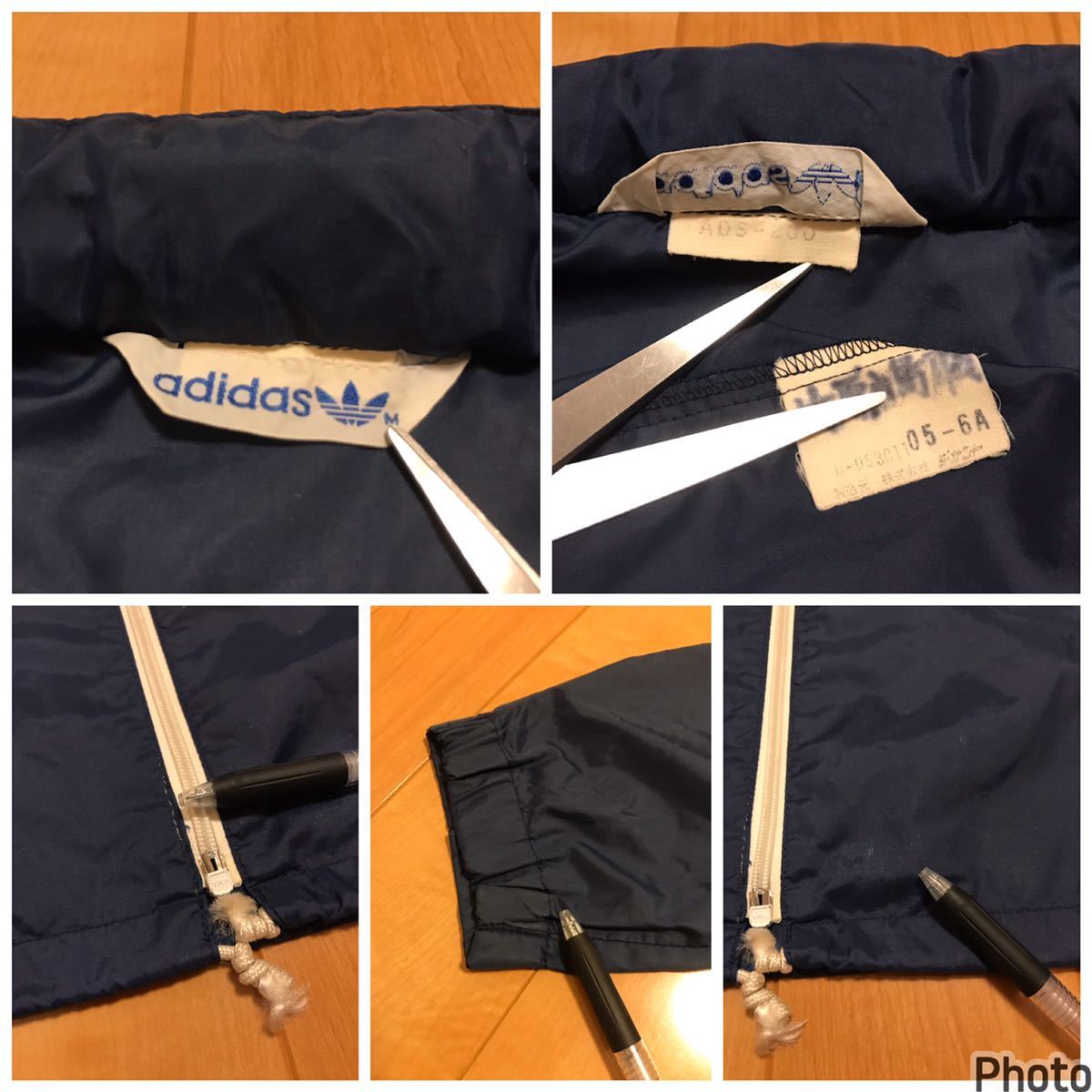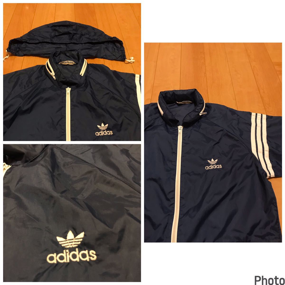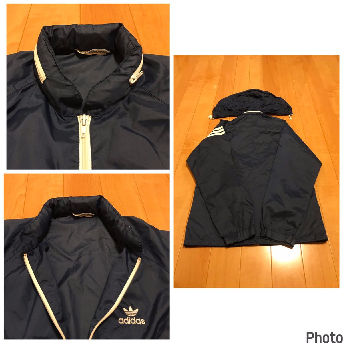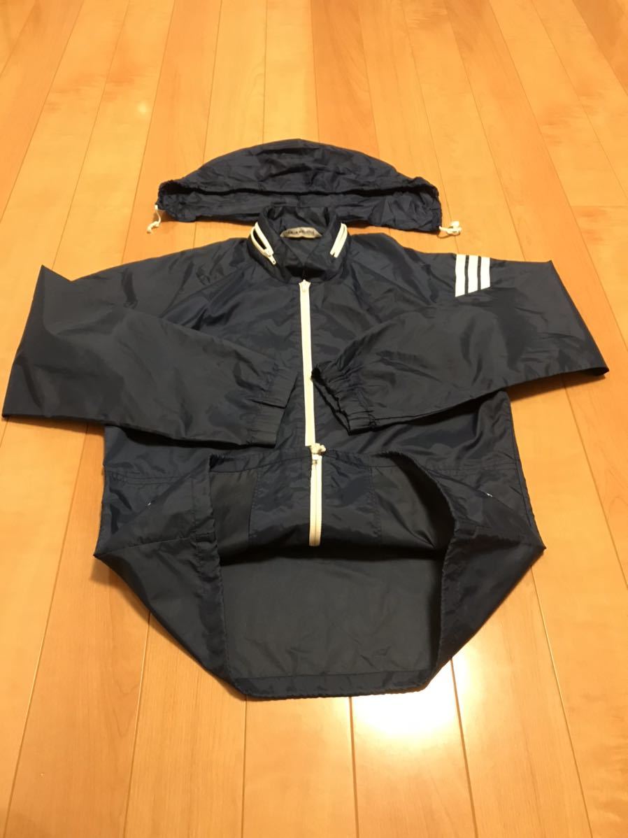 良品☆デサント/80s adidas・アディダス サイズM ビンテージ フード収納式フルジップ薄手ナイロンジャケット OLD三つ葉ロゴ刺繍ジャージ