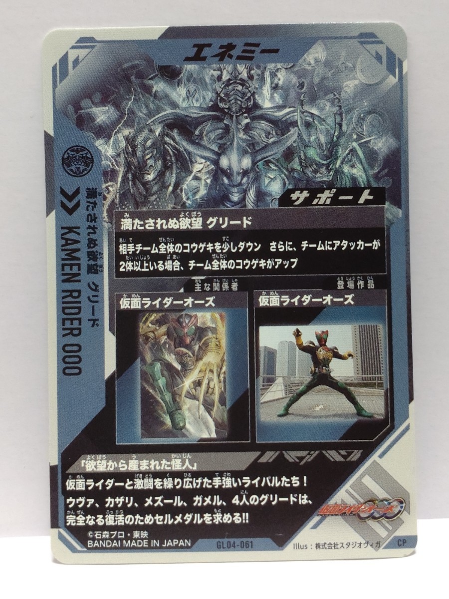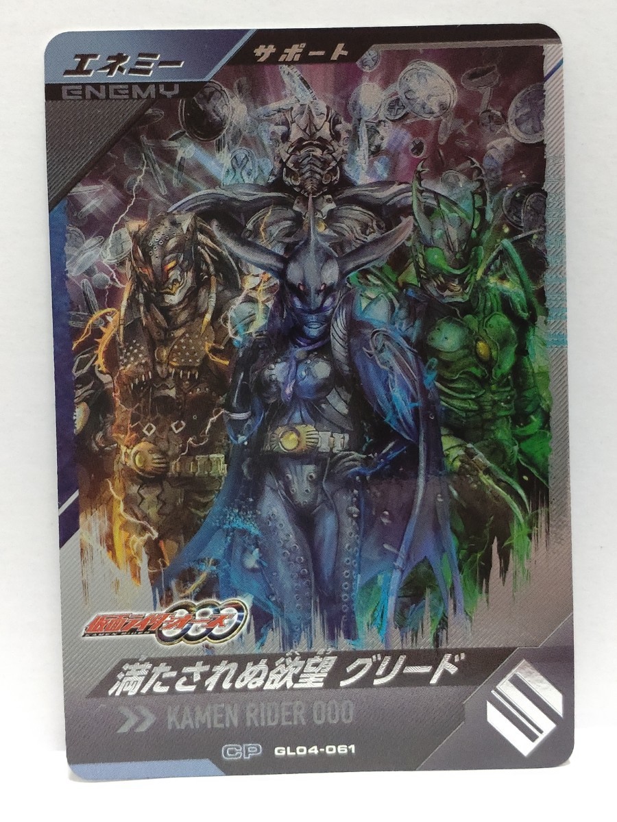 「仮面ライダーバトル ガンバレジェンズGL4弾 満たされぬ欲望 グリード(CP GL04-061)」を出品します。「おまとめ」可能な方は4枚までミニレター送料85円でお取扱いできます。5枚以上の場合は定形郵便で送料別途計算となります。