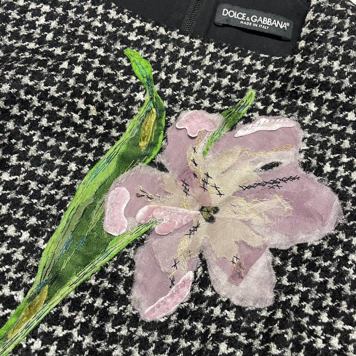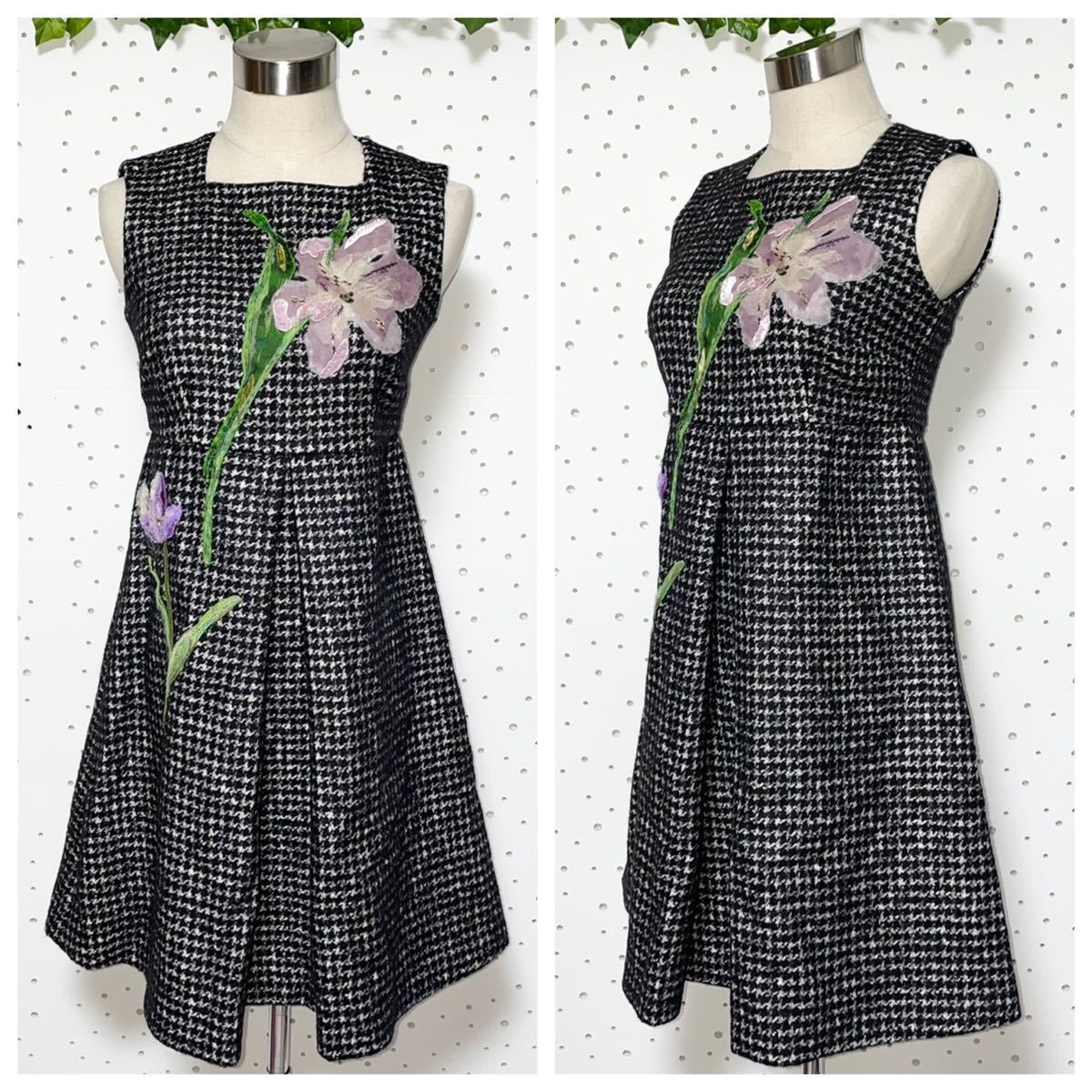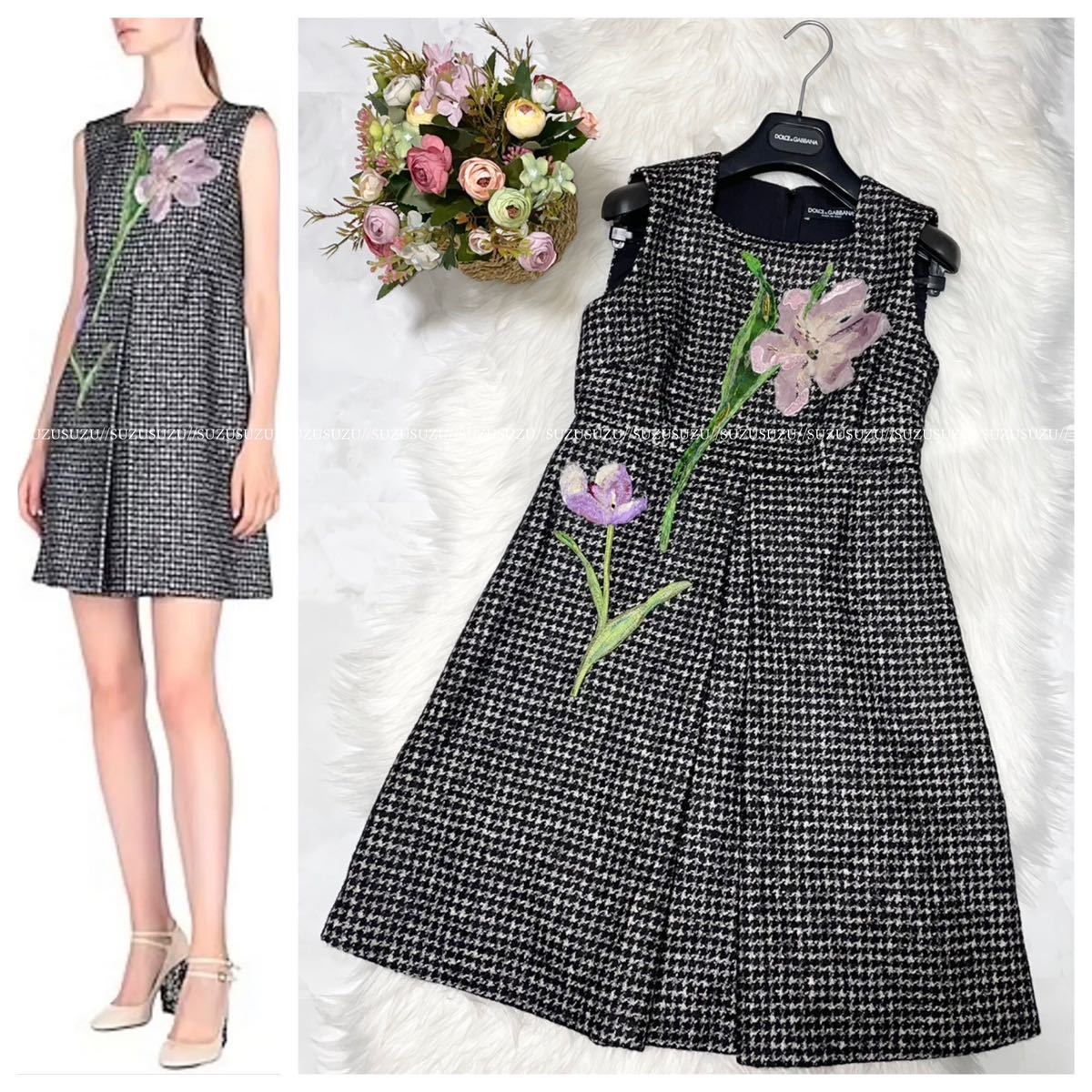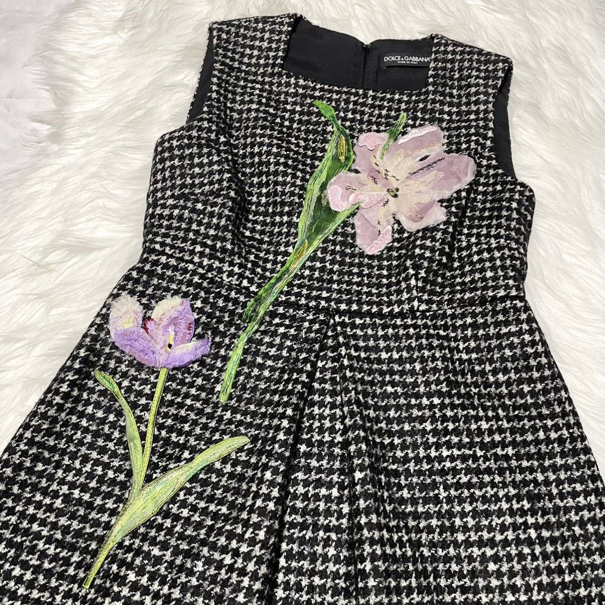 本物 美品 ドルチェ&ガッバーナ フラワー 装飾 刺繍 千鳥格子柄 ツイード ノースリーブ ワンピース ドレス 36 ドルガバ DOLCE&GABBANA | |||