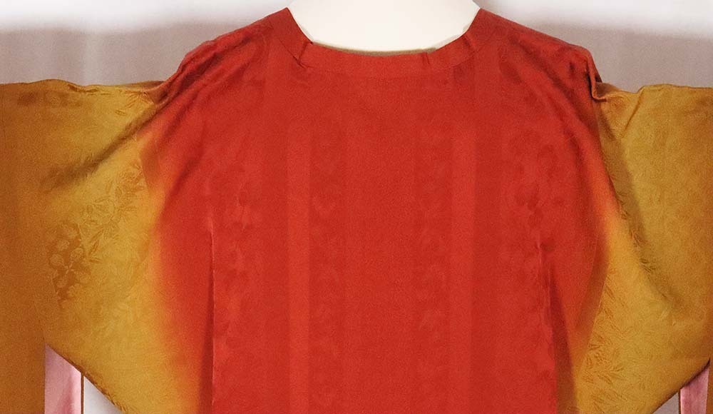 | 秋・冬用 和装コート 道行コート 赤・若草色ぼかし地花縞 左肩に葡萄柄 未使用品 仕付け付き | |