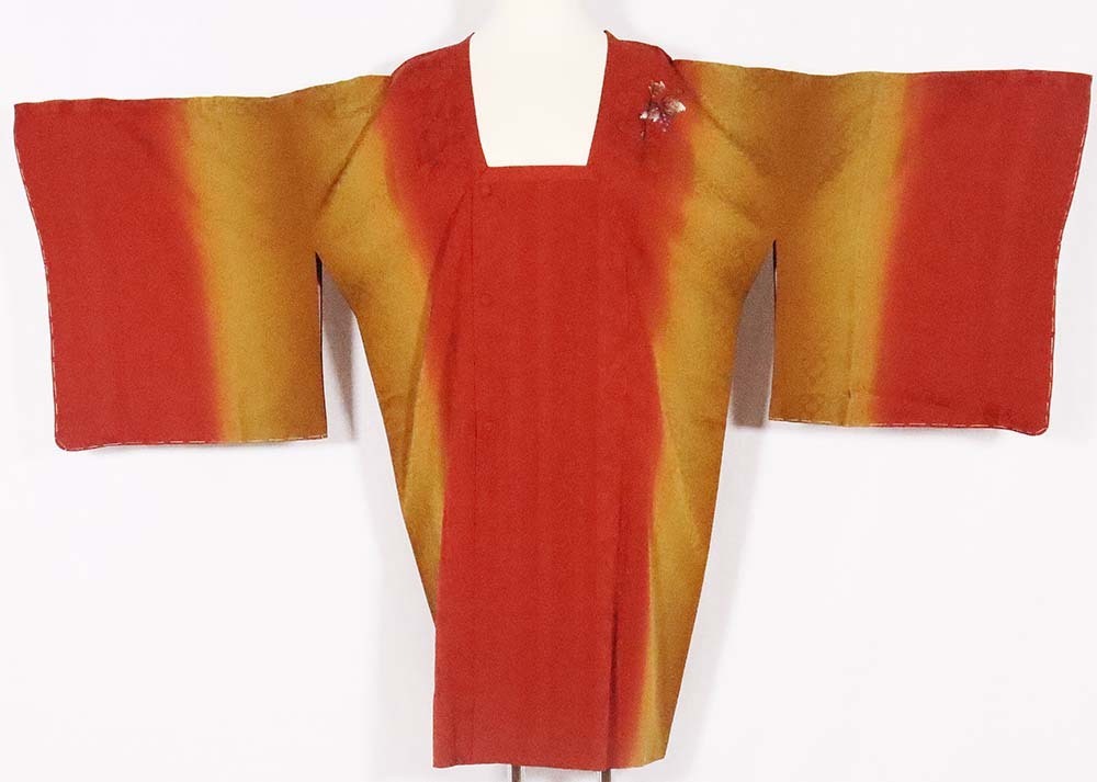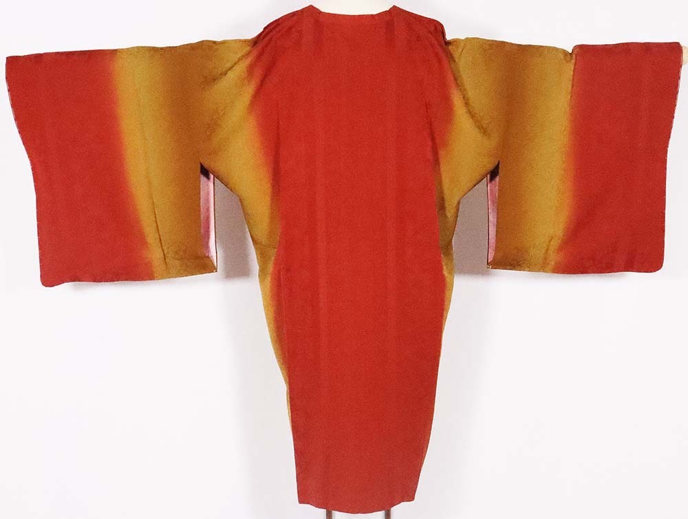 | 寸法 | 身丈:約92cm(背筋後襟下より裾までの採寸) 裄丈:約72cm(裄丈は出ないと思います) 袖丈:約49cm 袖幅:約36.5cm 後幅:約34cm 両肩の縫い代約cmずつあります。 (実寸で採寸していますが多少の測り間違いはご了承下さい) |