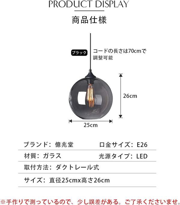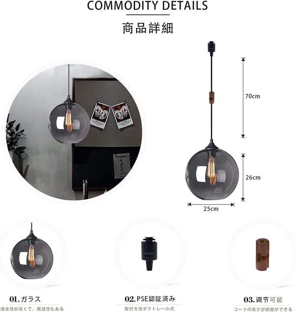 • 【商品仕様】:直径25cmx高さ26cm。コード(ケーブル)の長さ:70cm 調整可能 (70cm以上お選びいただいた場合、加工が必要ですので、どうぞご連絡ください)取付方法:ダクトレール式。材質: ガラス。 点灯方式:壁スイッチ 。重量:(約)1100g  【口金サイズ】:E26。消費電力: 40Wx1 ※白熱電球、電球型蛍光灯、LED電球に対応可能。※ご注意:電球をあまりきつ過ぎしないように、取り付けてください。(電球別売り)。