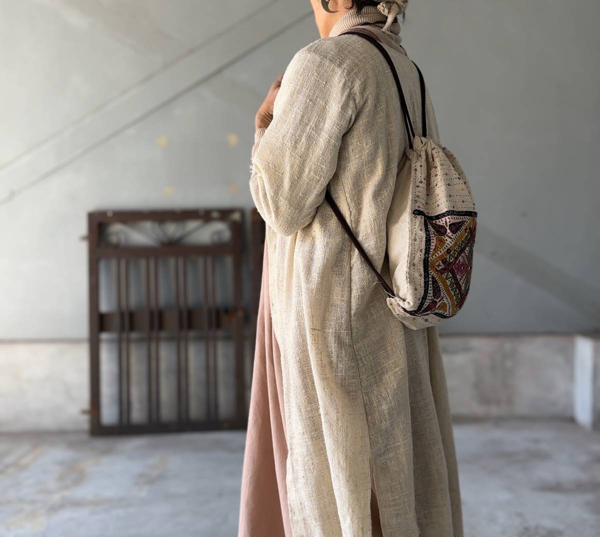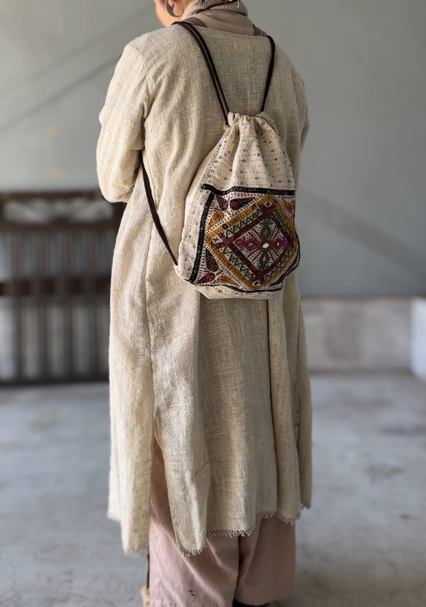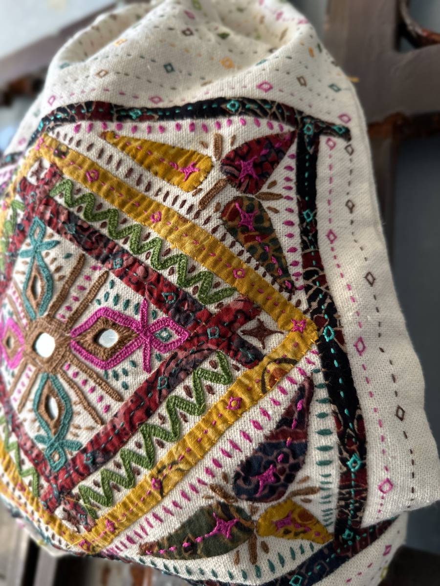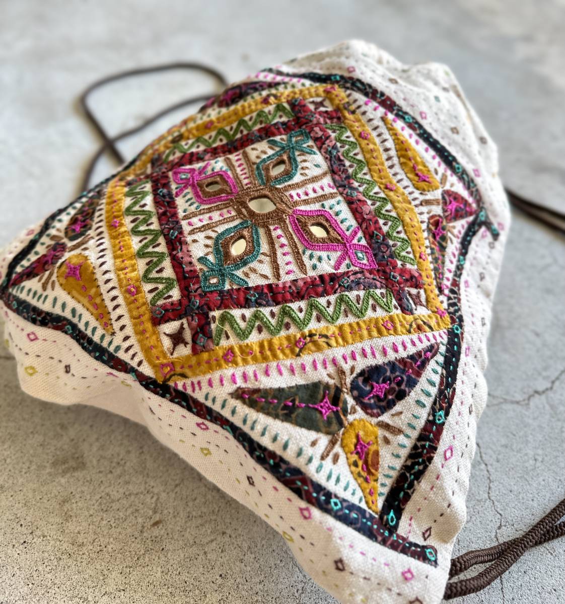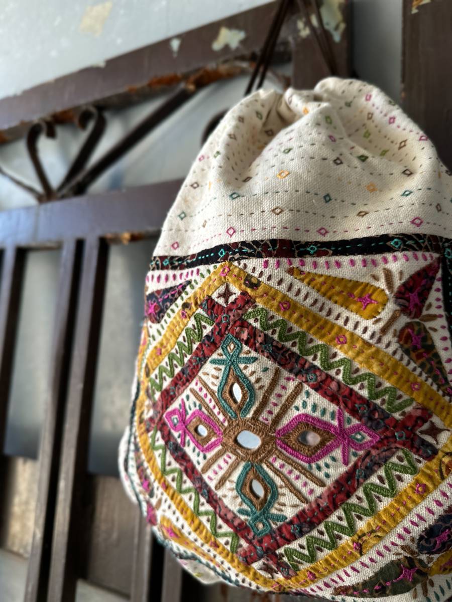 コットンキャンバス地に、伝統的な刺繍と、パッチワーク、ミラーワークが施されています。
