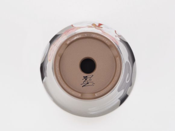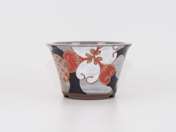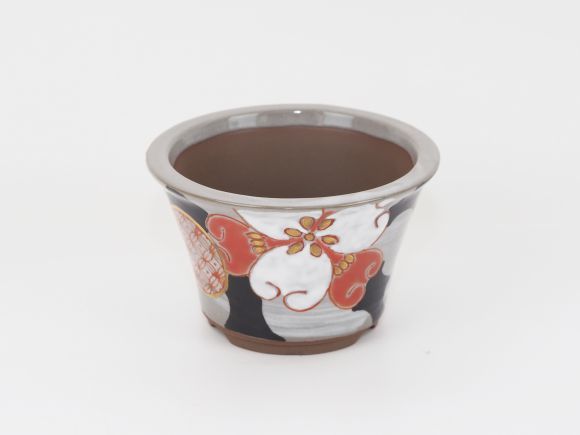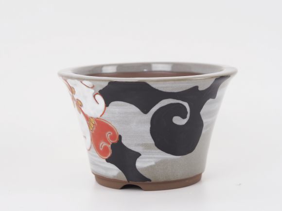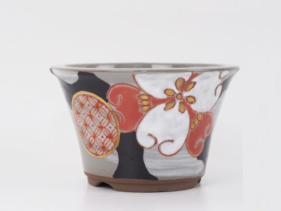 石川県の水墨画協会展などで最高賞、県知事賞を受賞した佐藤剛(剛志)氏が描いた小紋。美しくインテリアとして飾りたいと感じる鉢。よく絵を触ると、絵付けの少しデコボコした感じがあり、それもまた味になっている。
