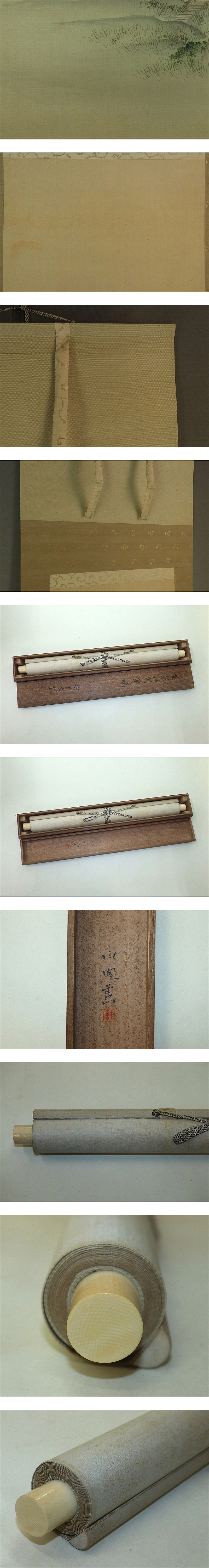 武部白鳳 (1871-1927) 明治・昭和期の大阪四条派の画家。大阪住。 本紙は、染み、軽い折れ、軽い皺、ヤケがあります。 表装は、染み、汚れ、皺があります。 【サイズ】 作品 横約36cm×縦約120cm 表装 横約49cm×縦約204cm |