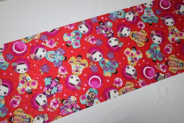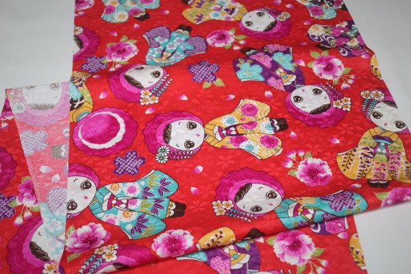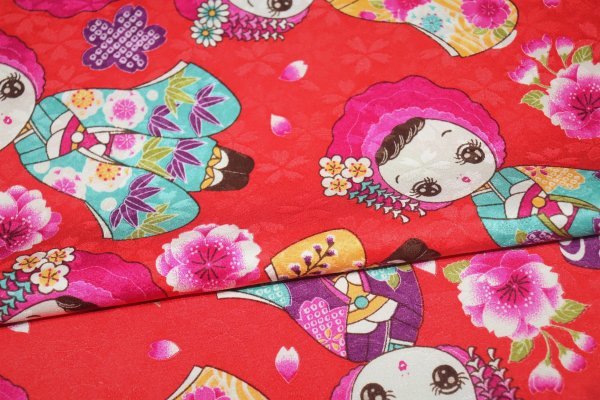 | 【京わぎれ】正絹 友禅染はぎれ お人形柄(振袖姿) 赤地 桜地紋 表物用生地 2.6m① | ||||