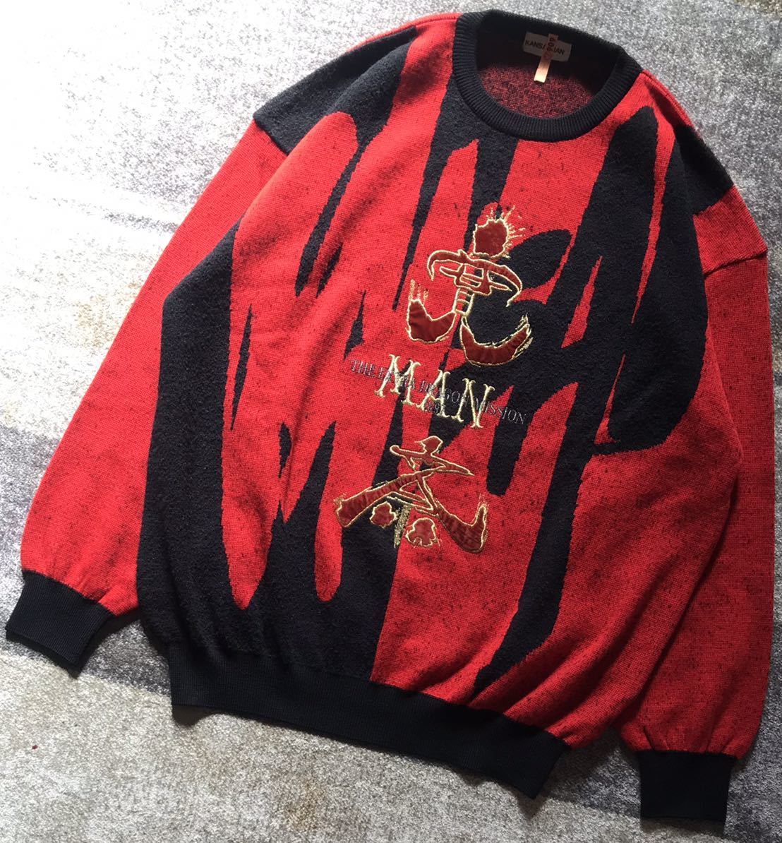 この機会に衝撃の1枚、90's vintage、KANSAI MANの漢字&英字柄、ニットセーターを是非いかがでしょうか?