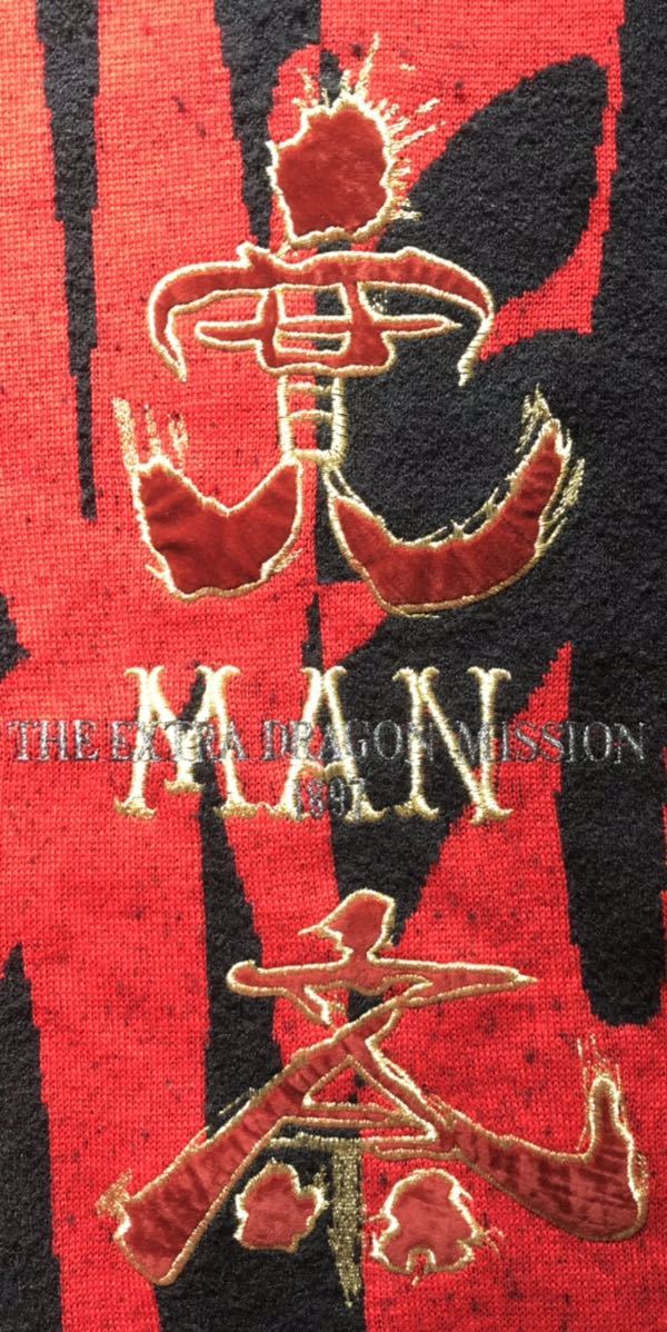 全体の斑模様、「寛斎」を縁取るゴールド刺繍、「THE EXTRA DRAGON MISSION1897」のシルバー刺繍、カッコいい字体&配色、大胆なデザインの構図等、飽く無き洋服作りへの拘り、エネルギーが凝縮された、世界にも通用する寛斎氏の底知れぬセンスが光る1枚です。