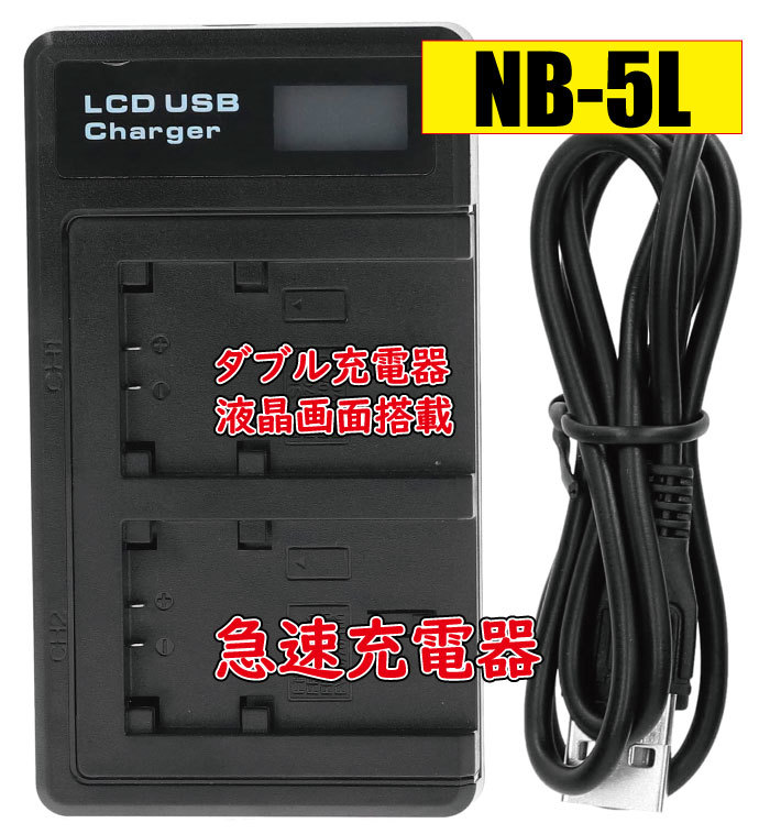 【送料無料】バッテリー2個同時充電可 CANON キャノン NB-5L USBケーブル付き AC充電対応 シガライター充電対応 互換品