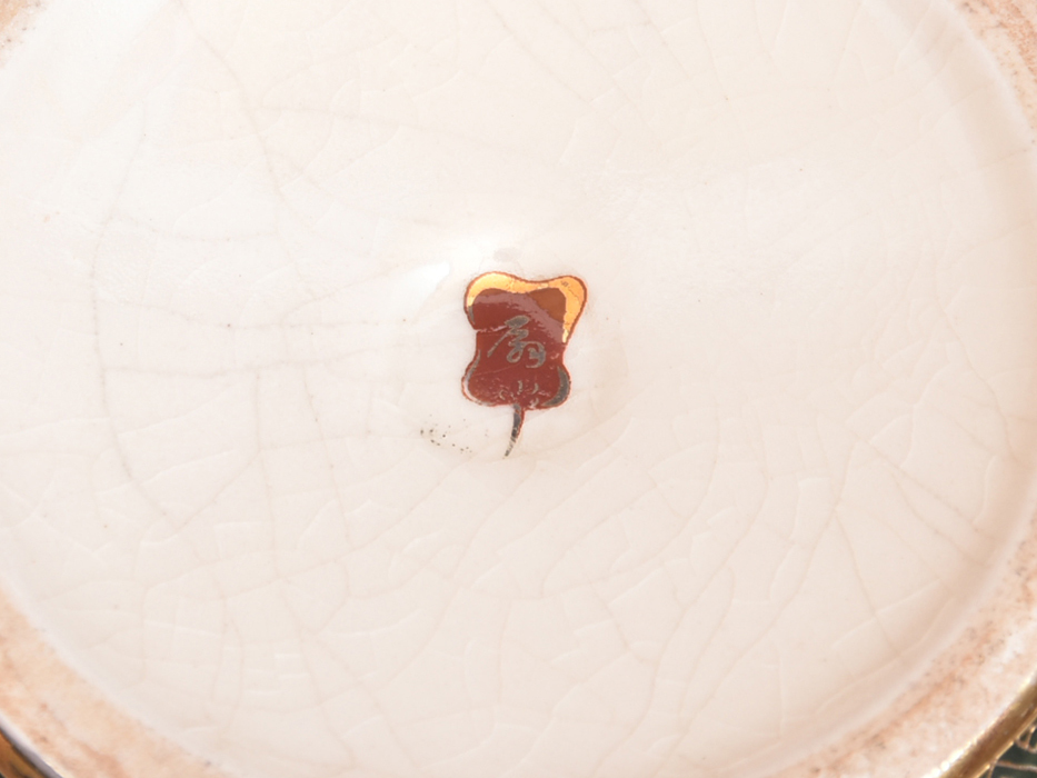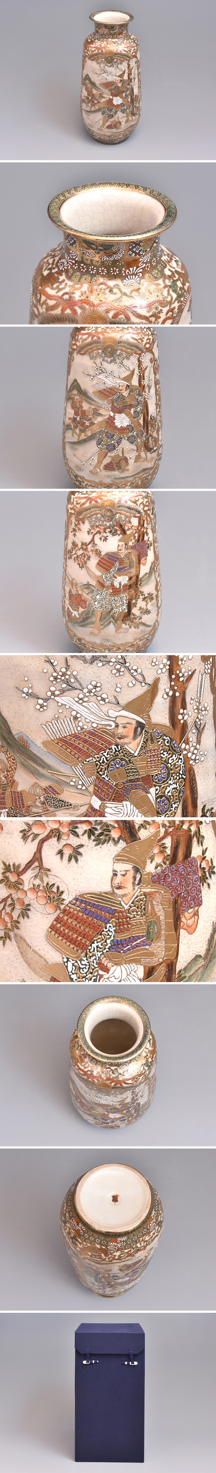 明治期に製作された薩摩焼の花瓶です。 全体に豪華絢爛な絵付けで源氏武者図が勇ましく描かれております。 おそらく源頼朝と思われます。 また上部には鳳凰文様、地紋、花鳥図、人物文等、多様な顔が見られ、景観にも富んでおります。 要所要所に立体的な装飾が施され、大きさ、状態共に良く、手の込んだ秀逸品です。 底に銘「扇山」あり。 時代の割にはキズ等なく良い状態です。 ※撮影の際に生じた写り込みなどがございます。 ご理解の程よろしくお願い致します。 |
