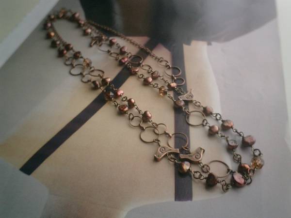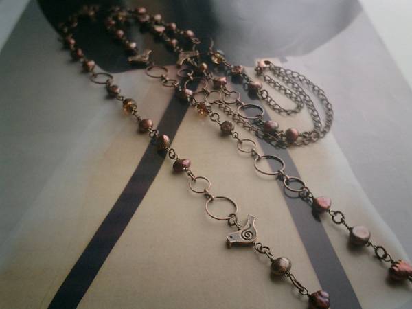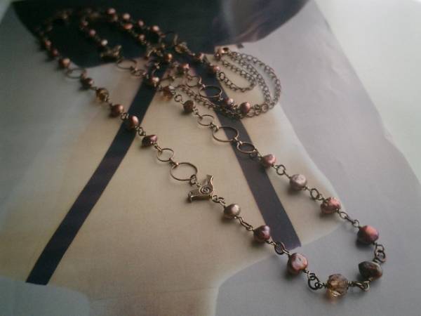秋の美術館・・シリーズです♪シックな小鳥さんと淡水パールのネックレスです♪♪落ち着いたブロンズレッドの淡水パールと小鳥さんのメタルチャームが大人のロマンチックしています♪♪ブロンズレッドの淡水パールは7ミリ位のバロックです♪小鳥さんのメタルチャームやチェコビーズを合わせて可憐な表情です♪長さは全長116センチ位で調節自由です♪画像のように2連にされても素敵です♪同じデザインの長さ違いのネックレスやブレスレットも出品しています♪♪シンプルで飽きのこないいつまでも着けられるデザインを考えて作りました♪ハンドメイドをご理解頂いてノークレーム、ノーリターンでお願いします