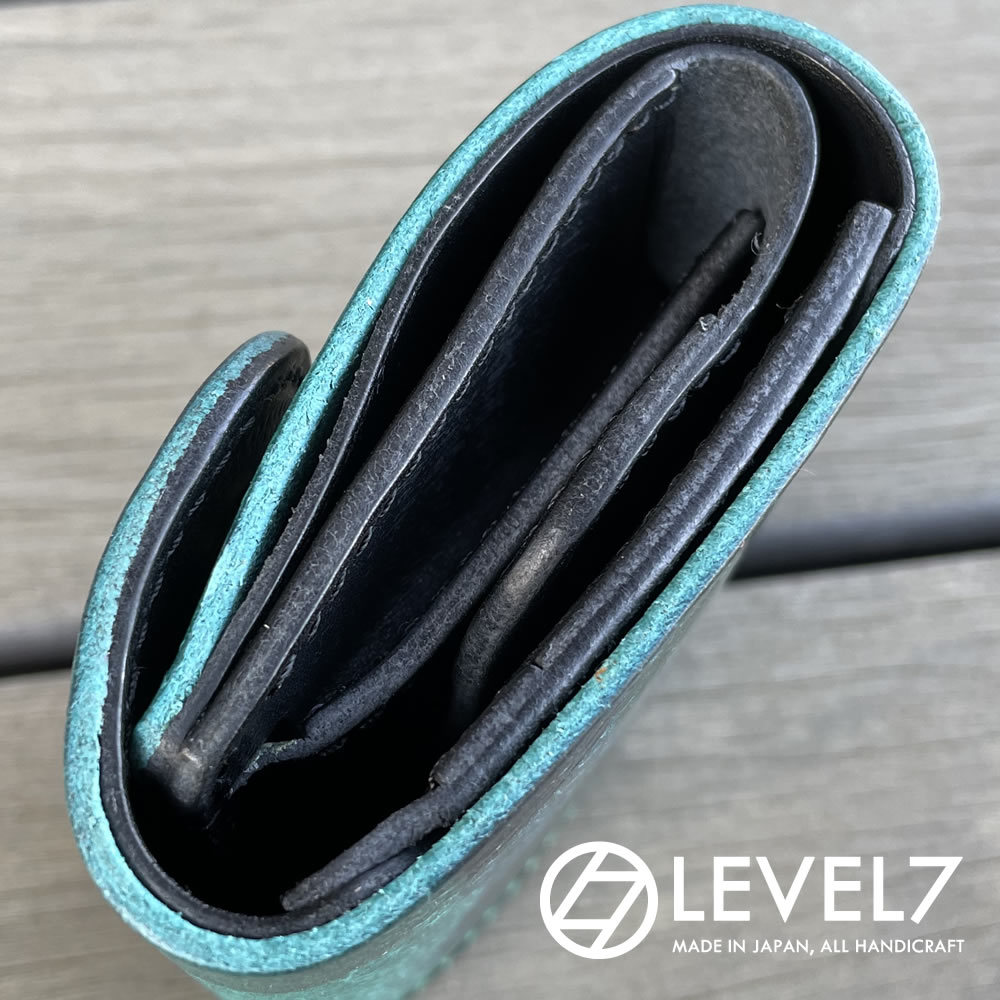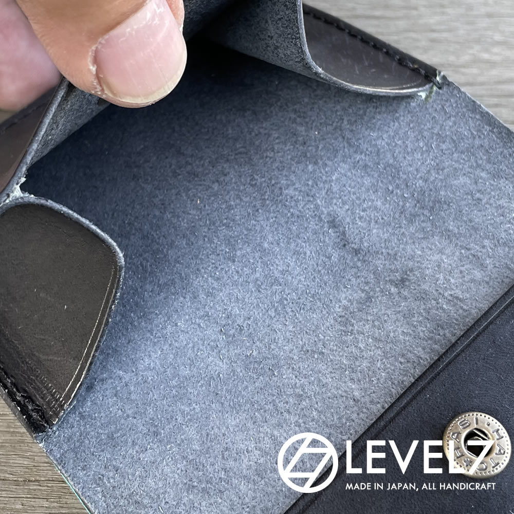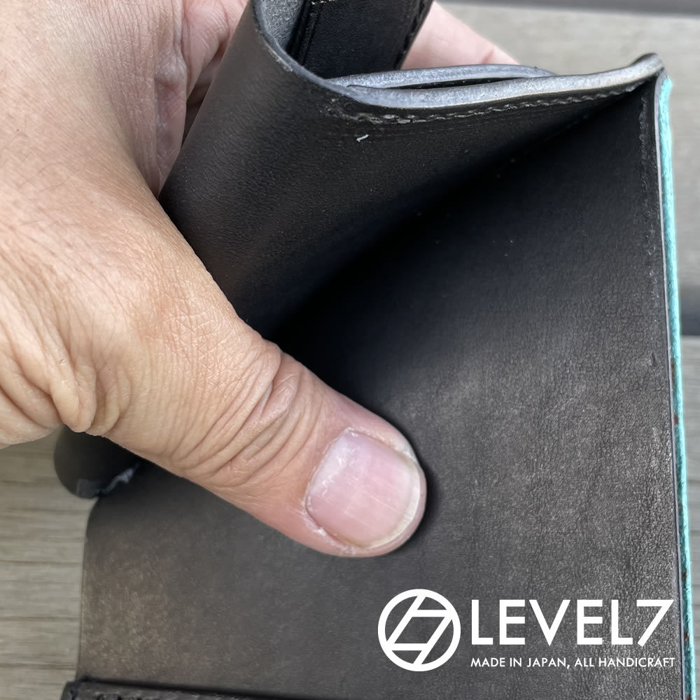 ■イタリアンレザー【クラスト】について La Perla Azzurra / ラ・ペルラ・アッズーラ社にてなめされた100%フルタンニンの生成りのヌメ革、部位は、ショルダー(ダブル)を使用。使用する原皮は、100%ヨーロッパ産、使用する天然タンニンはアルゼンチン産のケブラチョとコダワリ、丁寧になめされた上質なレザーです。 ■アンティーク足踏みミシン LEVEL7では、一部の製品を除き、このミシンが無ければ、仕事にならないとまで言わしめた名機SEIKO TE-5にて、全縫製を行っております。 大きな特徴として、糸締りが良いことが上げられます。 この立体的な縫目は、他のミシンでは、再現できない唯一無比のステッチです。 SEIKO TE-5は、シンガー(SINGER)社の17ミシンを基に造られた日本製のミシンです。 17ミシンは、主に袋状の製品(バックなど)、小物を製作するために造られた腕ミシンで、100年以上前に誕生し、現在も同規格のミシンが生産されている名機です。 LEVEL7では、そんな17ミシン【SEIKO TE-5】を発売当初と同じ、人力の足踏みミシンとして縫製を行っています。 こちらの製品では、インナーのカード入れの裏止め部のみにミシン縫製を採用しています。 ■コバ処理と床面処理 当社では、すべての製品パーツの裁断面にコバ処理を行っています。 断面部を革包丁、ヤスリで整え、革の毛羽立ちを押さえる仕上剤を塗り、磨き上げ、更に細かいヤスリで面を整え磨き上げを繰り返し、 蜜蝋を主な成分とした当社特性ワックスを塗りこみ、低温で焼き締めるまでの処理を行っています。 床面については、革の毛羽立ちを押さえる仕上剤を塗りこみ、毛羽立ちを抑える処理を行っています。 製品を購入する際、見えにくい部分ですが、切りっぱなし、漉きっぱなしで制作された製品とは、耐久性、坊汚性、耐水性、すべてにおいて勝り、妥協をせず、コダワリを持って制作しています。 |