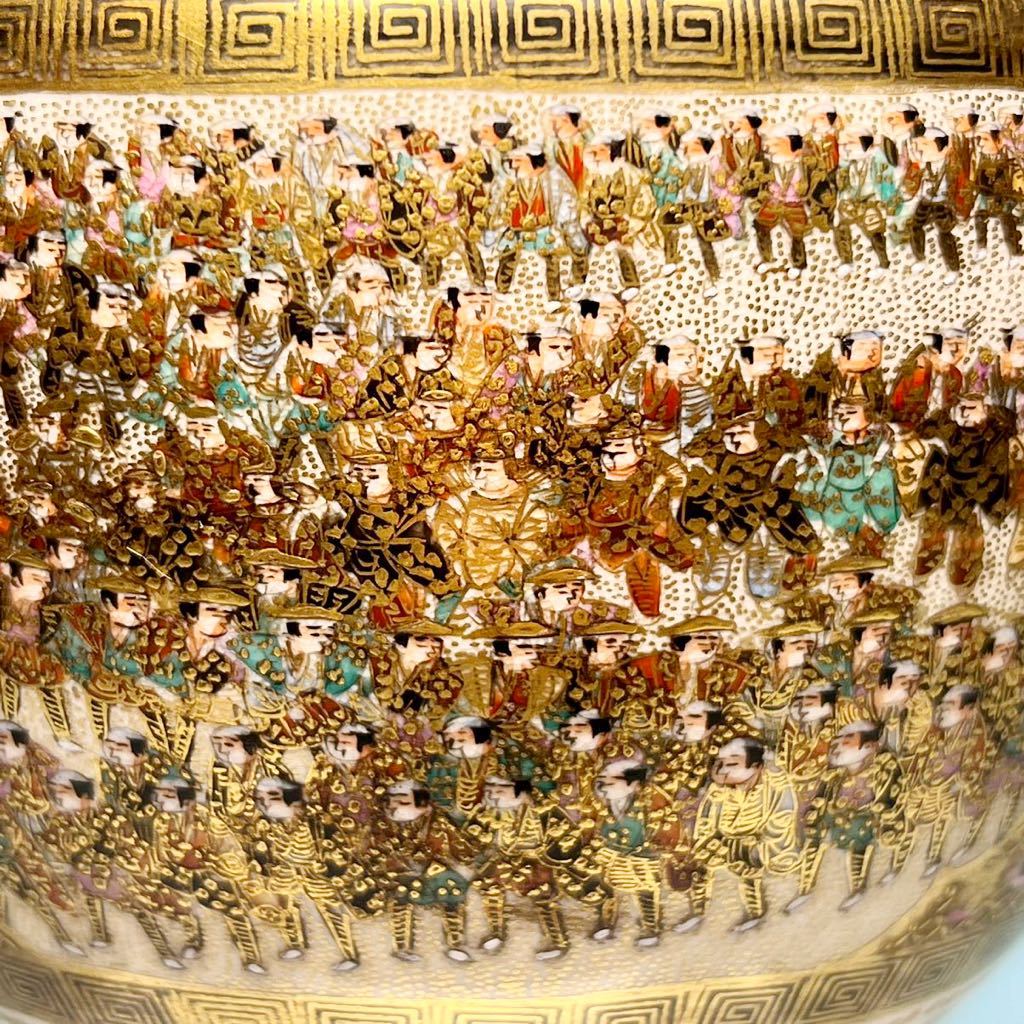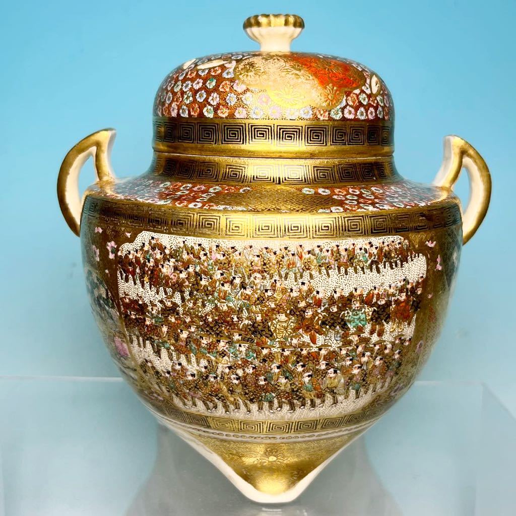 ☆ 明治超絶技巧 細密 色絵金彩 京薩摩 大名行列 香炉 在銘 (箱付) 薩摩焼