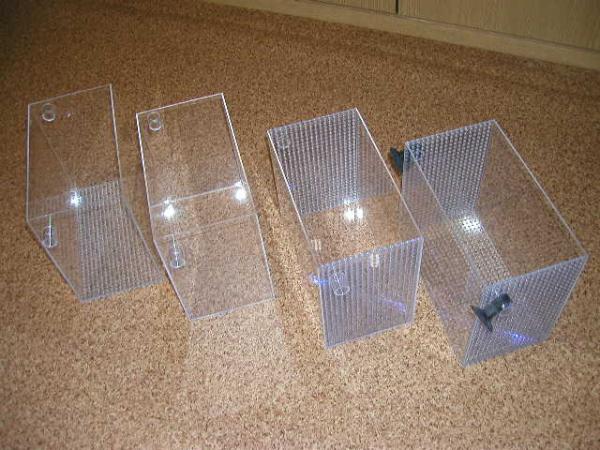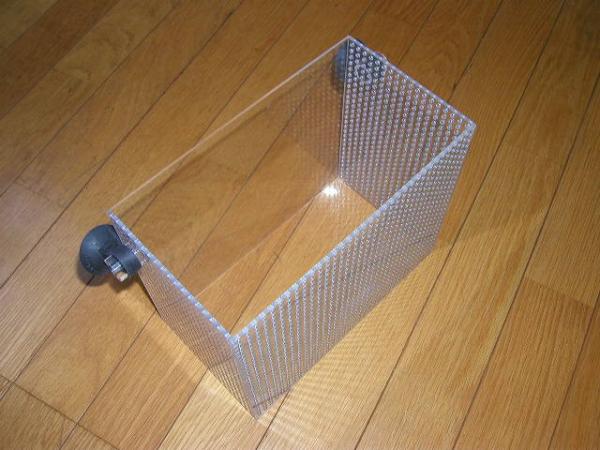 ご覧の特注多目的ケースです。サイズは幅24cm,高さ20cm,奥行き12.5cmです。前面・底面以外両サイド・背面パンチングになっていますので、フィルターなし・水換えなしで利用可能です。かなり便利。前面(鑑賞面)と底面だけ、透明クリアになっています ある方からの依頼での製作で大変喜ばれたモデルです。同時に出品していますアクリルケースと併用すればいろいろな飼育方法ができるかと思います。また、出品しています多目的ケースですが、60cm水槽に2個並べて設置可能なサイズに製作依頼したもので便利です。また、成長にあわせて使用すれば稚魚の引越し時のリスクの軽減・または追いつけない親魚の産卵ペースへの対応に大変便利です。質問はご遠慮なく。ノークレーム・ノーサポートをご了承いただける方の入札をお待ちしています。梱包料、消費税、手数料の請求は一切ありません。ほかにも出品していますので宜しくお願いいたします同時落札していただけましたら、送料・お振込み手数料がお安く済みますのでお勧めです。 ただいま取り付け用のキスゴム(新品)をサービス中です。ご検討を・・・!! また、このケースは前面(鑑賞面)が一面透明となっておりますので、鑑賞にバッチリです。吸盤固定ですと、劣化が早く本水槽にケースごと落下ということが度々ありますが、キスゴム利用ですので格段にトラブルを防止できます。