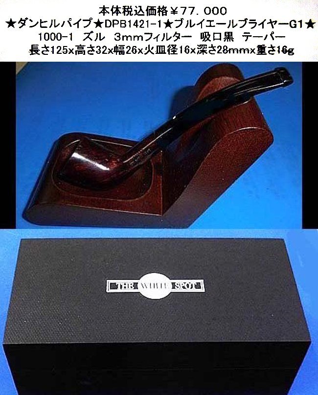こだわりのダンヒルパイプ。現物を写真撮影、お手元にこの写真の品が届きます。ブルイエール ブライヤーG2(Group2) シェープはズル、3mmフィルター仕様です。ダンヒルの有名な濃いマホガニー色のスムース仕上げ。杢目がうっすらと表面に浮かび上がる。ボウルは小ぶりのハーフベントタイプ。16gと超軽量で手放しでのショートタイムの喫煙に向く。型番#1421(1は大きさ/4は吸い口 ベントテーパー/21はズル型。)吸い口はドイツ製エボナイトの手作り品 黒 です。ブルイエールとはフランス語でブライヤーの意味。Group はG1/G2/G3/G4/G5/G6とあり、数字が大きくなるにしたがってパイプも大きいサイズになる。ご注文商品は他商品と同梱配送出来ますので、何個ご注文されても送料は1口分です。ビンゴが出品している全ての商品は、店頭販売、オークション販売、ショッピング販売等重複し販売しております。時間差で売れ切れや、出荷点検検等で傷が付いていたり破損している事もあります。従いまして、お買い上げ頂きましても出荷出来ない場合も有りますので、予めご了承の上お買い求め下さい。ご注文商品は他商品と同梱配送出来ますので、何個ご注文されても送料は1口分です。1.レターパック発送 ¥600 日時指定不可。(郵便レターパック)。2.宅配便発送税込み ¥880日時指定必須(沖縄/離島は別途価格)。必ず 受取日時 をご指定下さい。(例:15日 18~20 時必着)再配達防止の為。 (業者は当社にお任せ)。3.代金引換発送引手数料税込み ¥1、210 日時指定必須(沖縄/離島は別途価格)。 必ず 受取日時 をご指定下さい。(例:15日 18~20 時必着)再配達防止の為。(業者は当社にお任せ)。