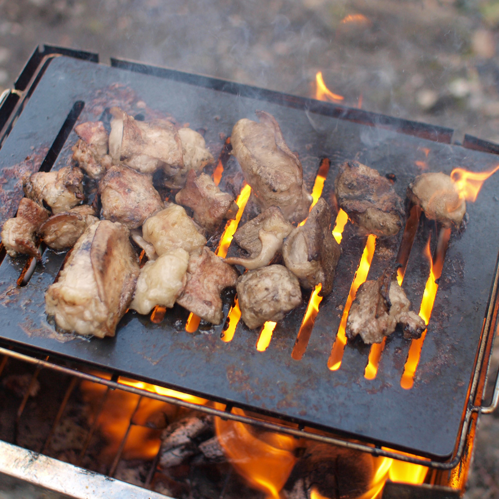 鉄板の焼面にスリットと呼ばれる細長い穴をあけ、炭火焼きでの調理を楽しめる加工をしております。