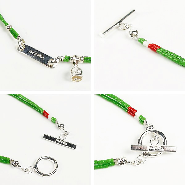 美しいカラーリングのビーズとブランドネームが刻印されたシルバーパーツを組み合わせ、カプリ島に古来より伝わるサン・ミケーレの幸運を呼ぶ鐘をモチーフにしたシルバーパーツをチャームにしたアクセサリーです。