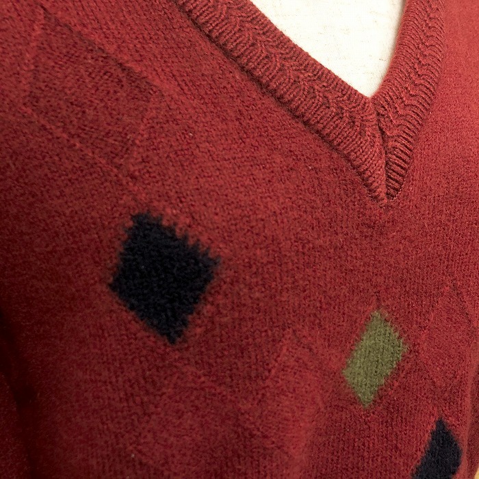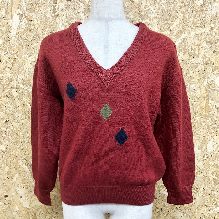 商品タイトル | Arnold Palmer アーノルドパーマー L レディース(メンズ?) ニット セーター Vネック ひし形柄 スクエア 長袖 ウール100% レッドブラウン系 |