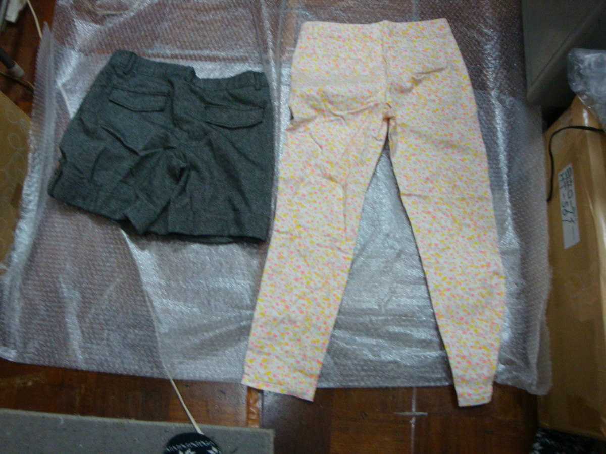 (13)ロングパンツ、白、橙、黄、淡灰。綿97%、ポリウレタン3%、ギャップ、カンボジア製。ウエスト64~68cm、丈82cm。