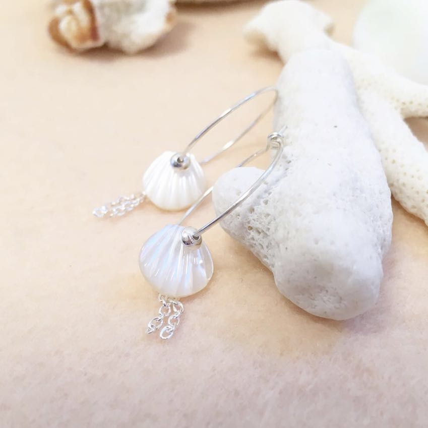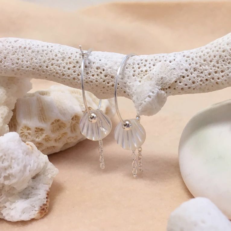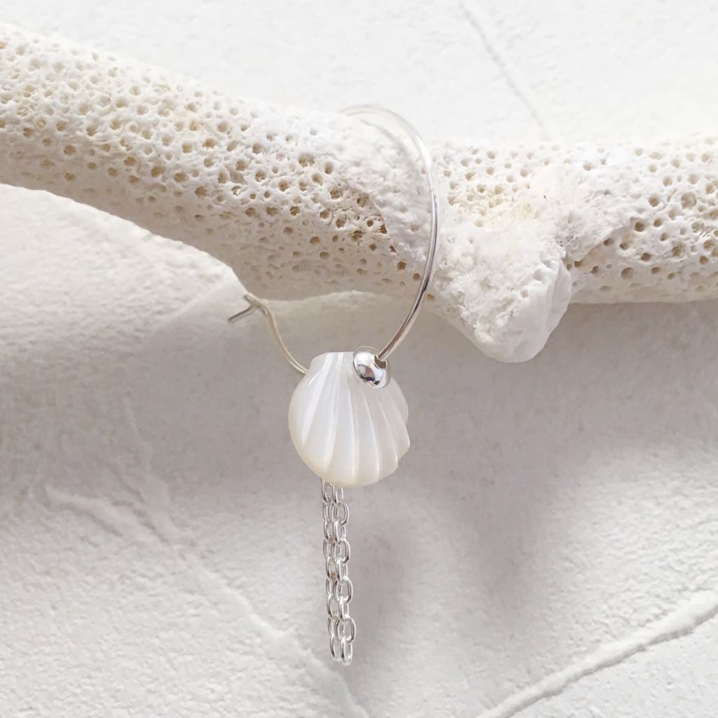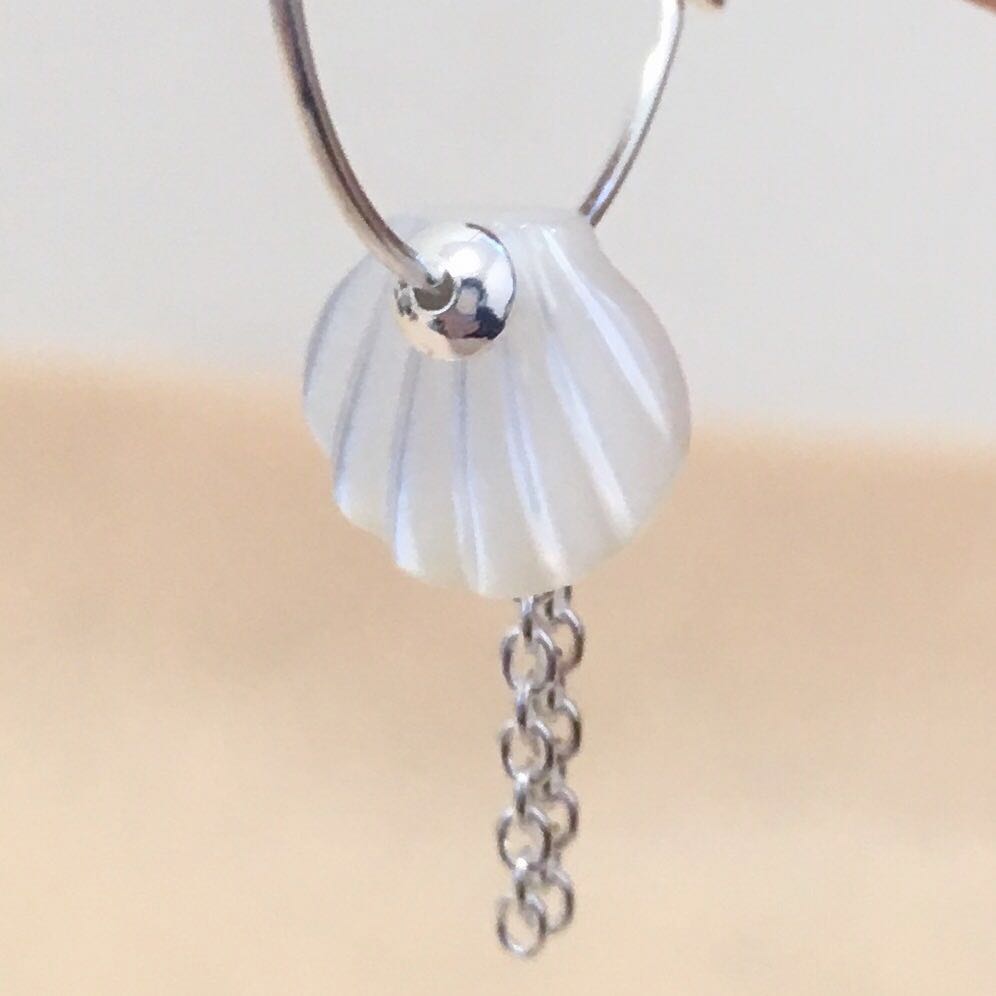 シルバーのフープピアスに貝の柔らかな光が爽やかなピアス。