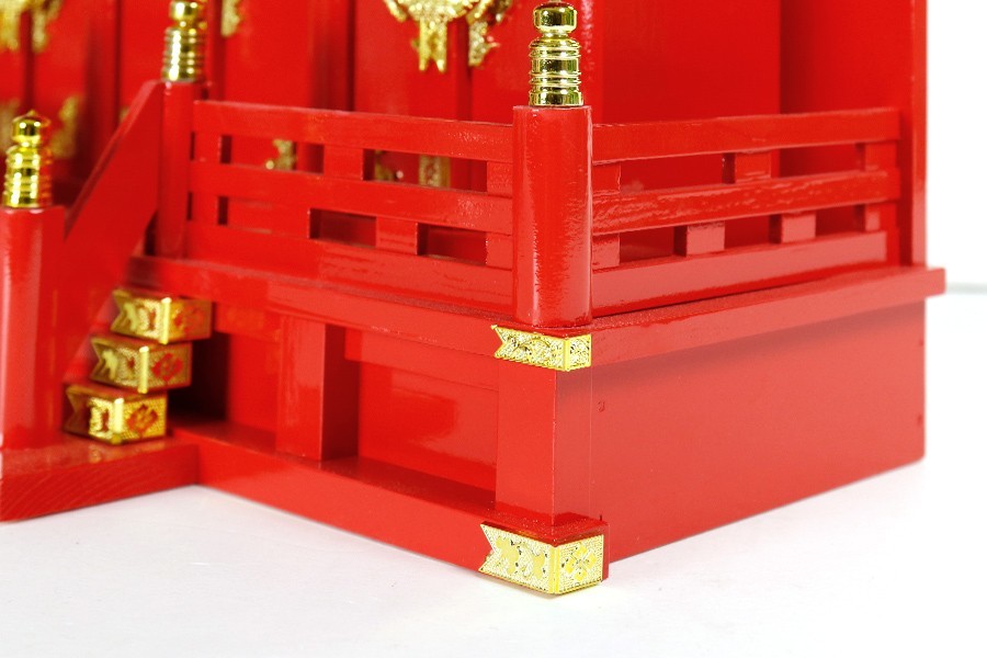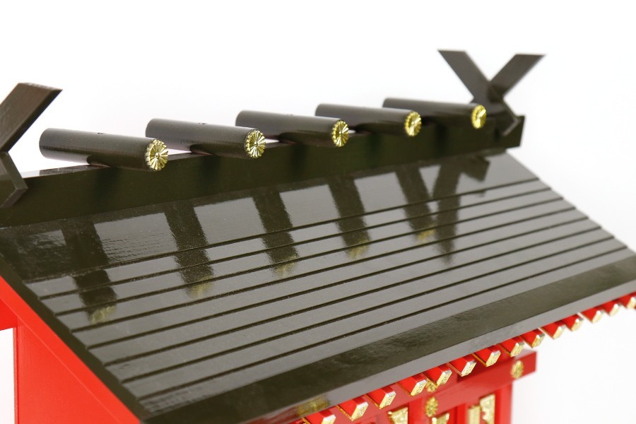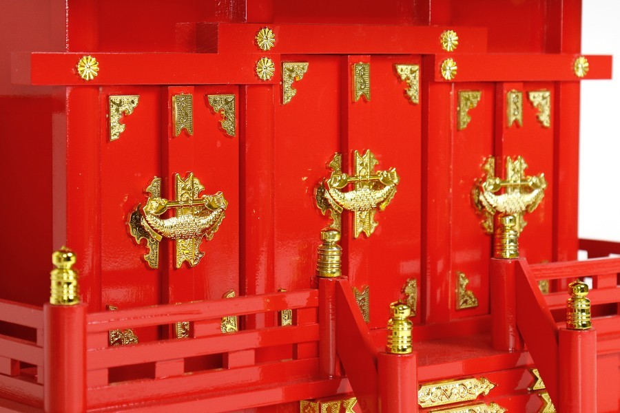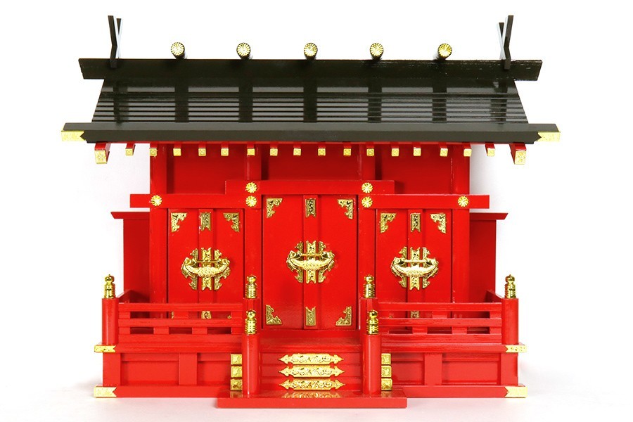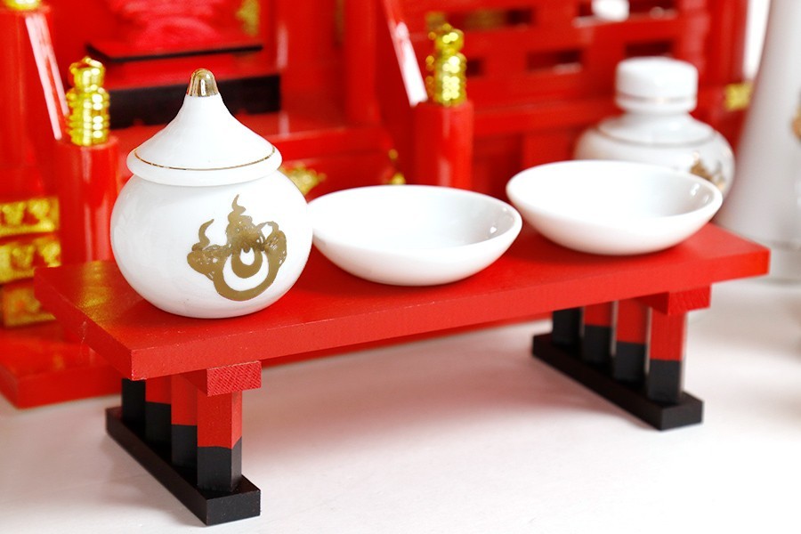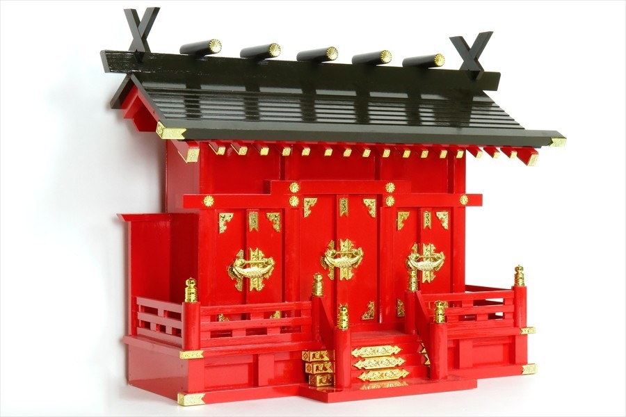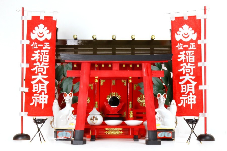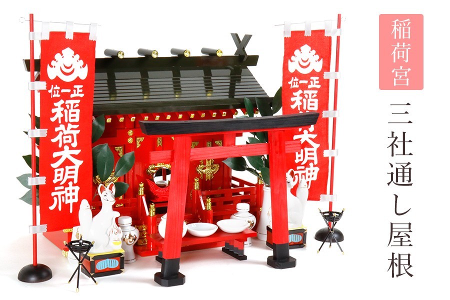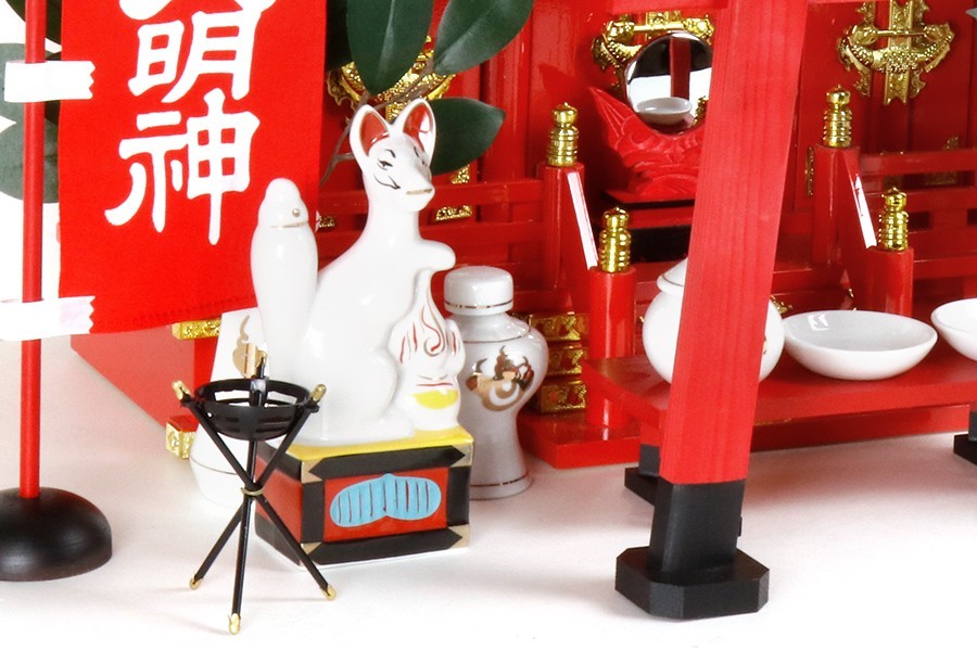 丹念な塗りを施した、光沢仕上げの美しいお社、お稲荷様をお祀りする専用セット。たくさんのお神札を収納できる、当店オリジナルの「三社・通し屋根」タイプです。職人手作業で組み上げられる純国産、丁寧な重ね塗りは見とれるほどの「朱」。お稲荷様を神々しくお祀りいたします。 神具は稲荷紋付きの専用陶器が付属、八足台と神鏡台も稲荷宮専用カラーとなっています。「お狐様」は瀬戸焼き陶器製が一対、威風堂々と社をお守りします。目を引く大き目の稲荷のぼり旗、かがり火もしつらえた、豪華な神棚一式。お稲荷様のお神札をお受けし、伊勢神宮の神宮大麻、氏神様や崇敬神社と並べてお祀りされる方にもおすすめの逸品です。 | ||||