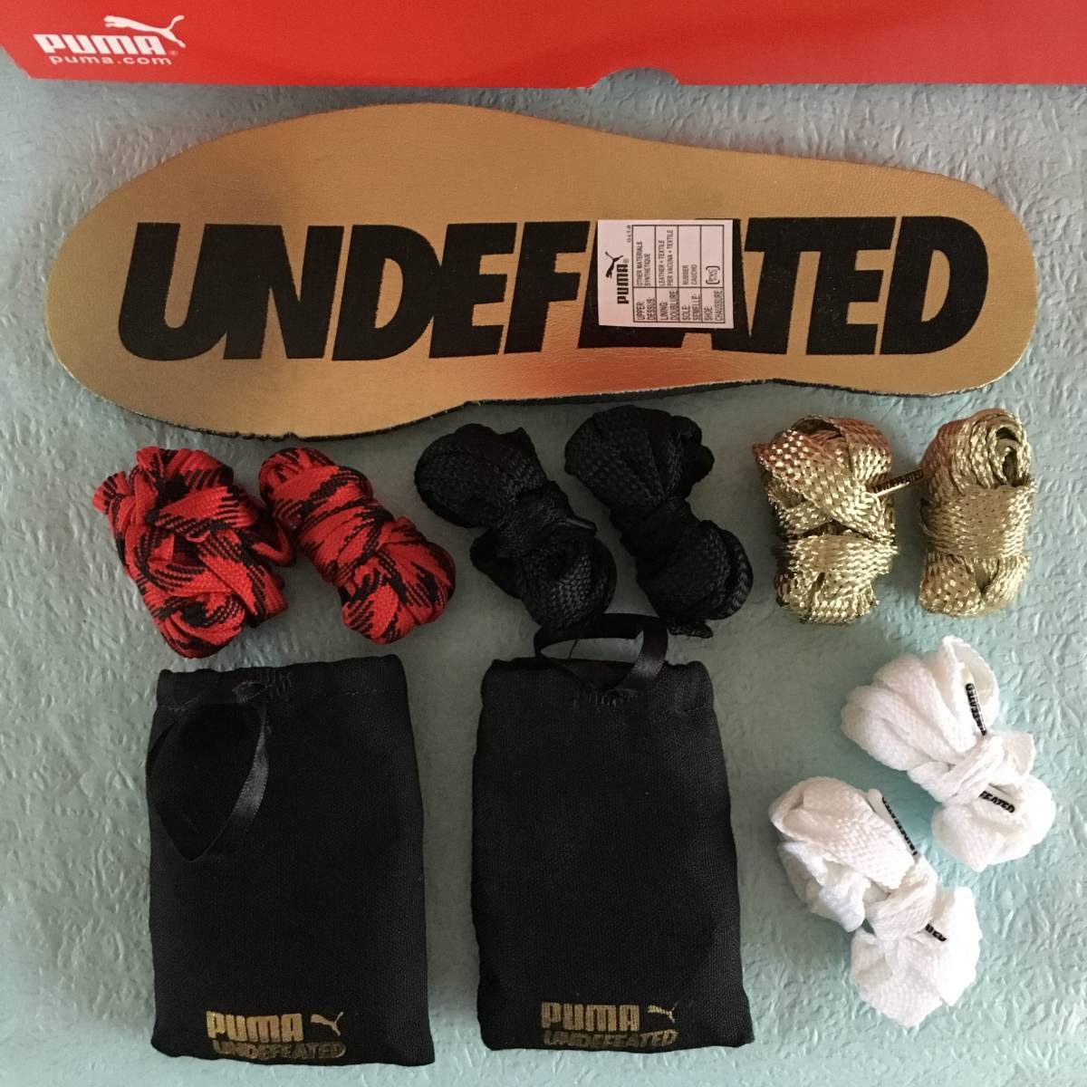 "RIBBON RED"パンチングスウェード上にUNDFTD×PUMAコラボの証しを金箔プリント、インソールはGoldベースに"UNDEFEATED"黒プリント、極め付きに金色【5STRIKES/PUMA】メタルタグを付属と『スニーカーゲーム』を仕掛け続けるUNDEFEATEDがPUMAと共に、シンプルで洗練されたラグジュアリー・ストリートを提案したDOPEな逸品です。