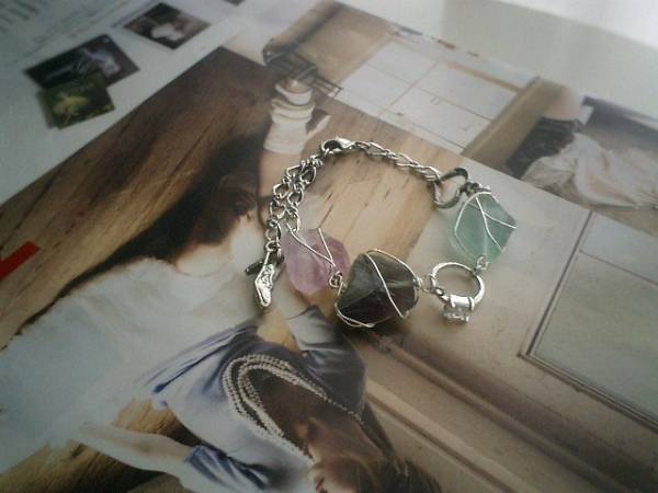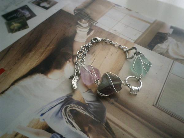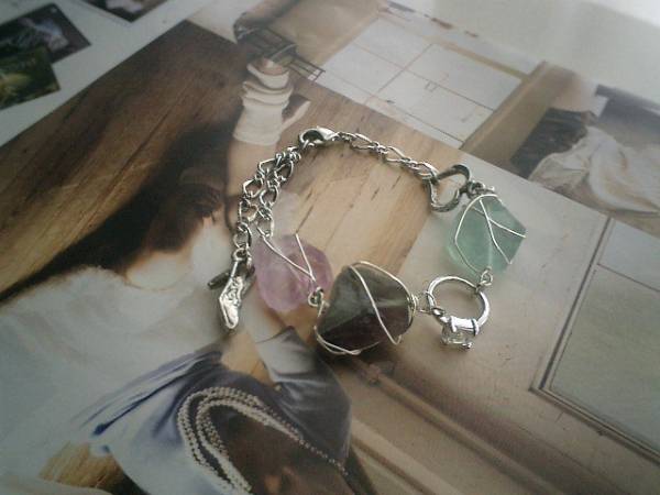 愛しいお気に入り・・シリーズです♪儚げな色を集めて・・繊細なフローライトの原石を集めたブレスレットです♪やさしい神秘的なお色が儚げにロマンチックしています♪ワイヤーでおめかししたパープルやダークブルーやモーヴピンクのフローライトは13ミリから16ミリ位のラフ・ロックです♪ジルコニアリングやハートのチャームを合わせて可憐な表情です♪長さは全長23センチ位で調節自由です♪お揃いのネックレスも出品しています♪シンプルで合わせやすいデザインを考えて作りました♪ハンドメイドをご理解いただいてノーリターン、ノークレームでお願いします♪