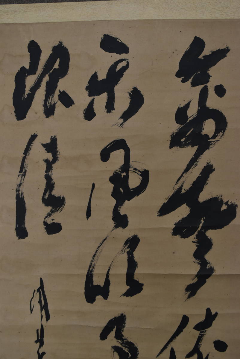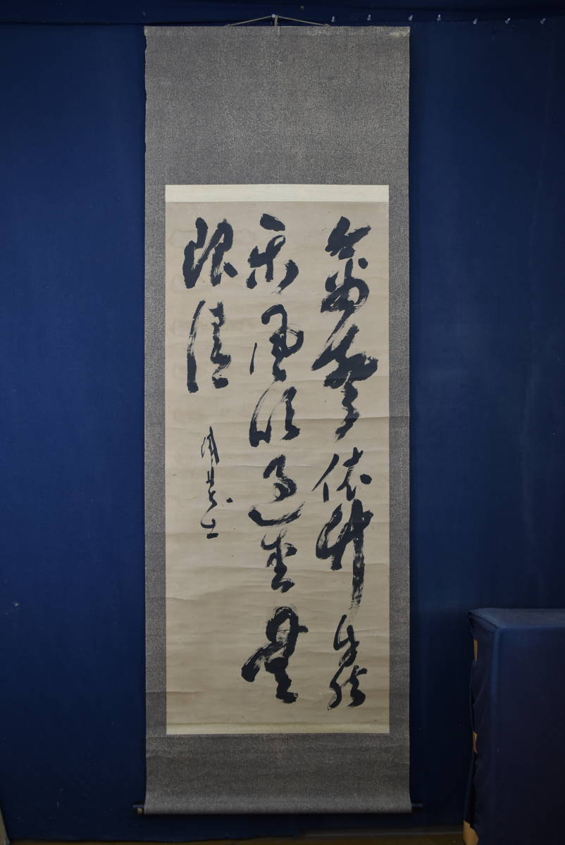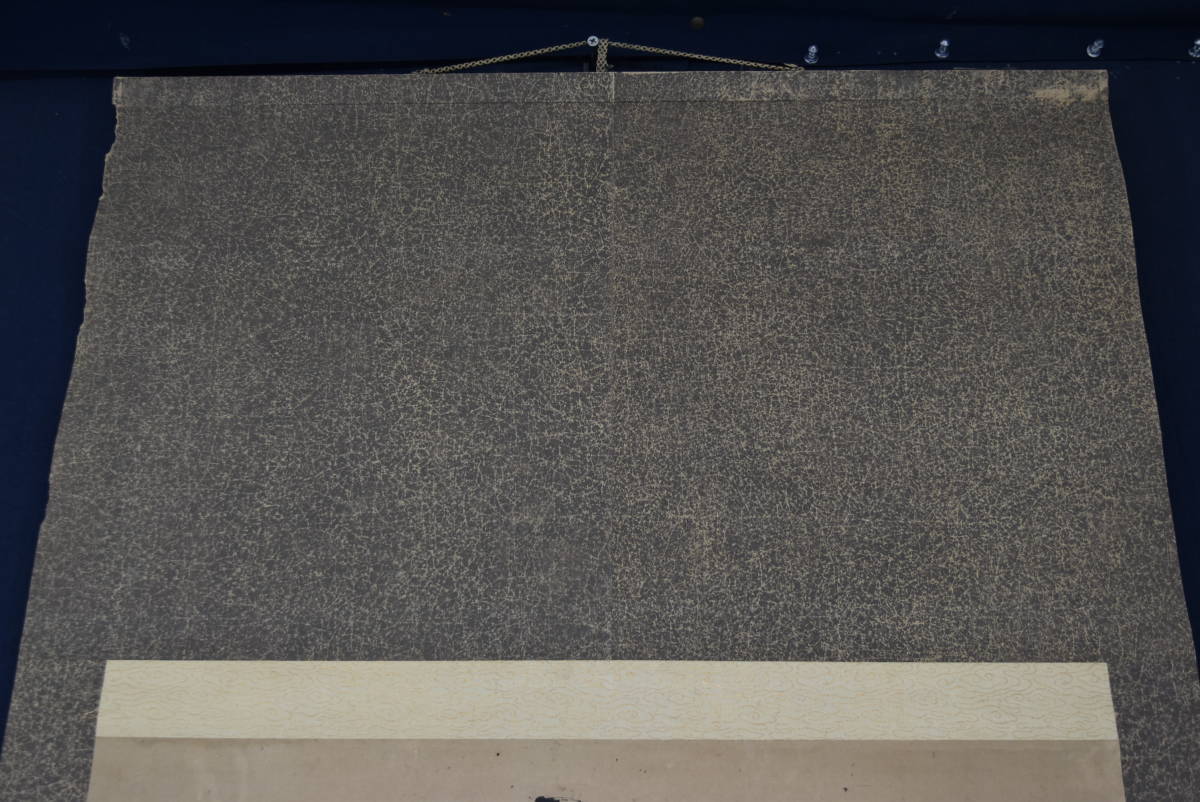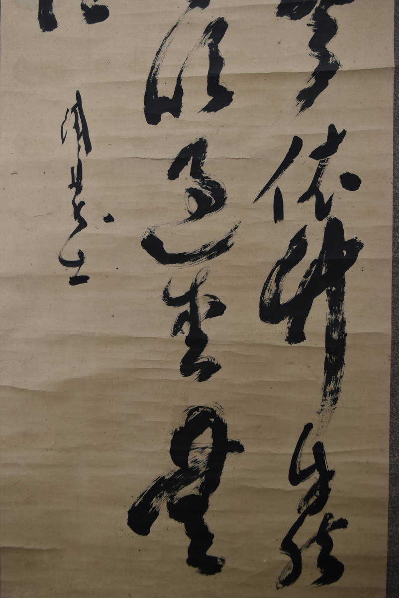 【作品状態】 本紙は紙本肉筆です。本紙は薄汚れ、全体に汚れシミ、多数の折れ、巻シワあります。表装は紙表装で、時代感あり、薄汚れ、天の左端に数ヶ所の欠損、折れ、巻シワあります。