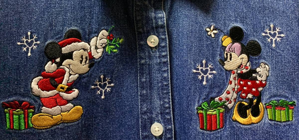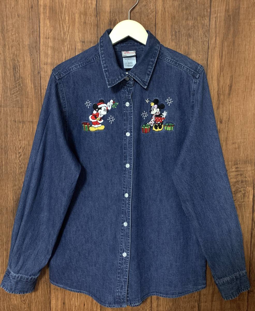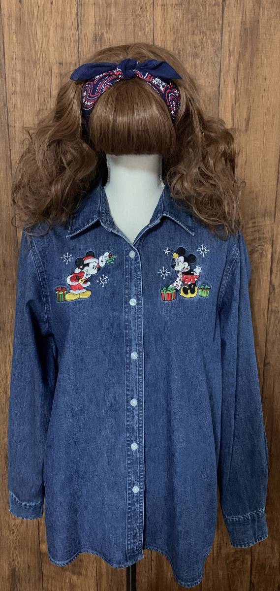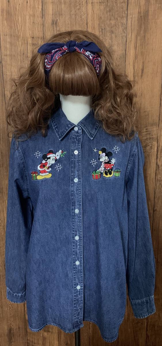 大人気キャラクター・ミッキーとミニーの刺繍が胸元に施された大人かわいいデニムシャツ。