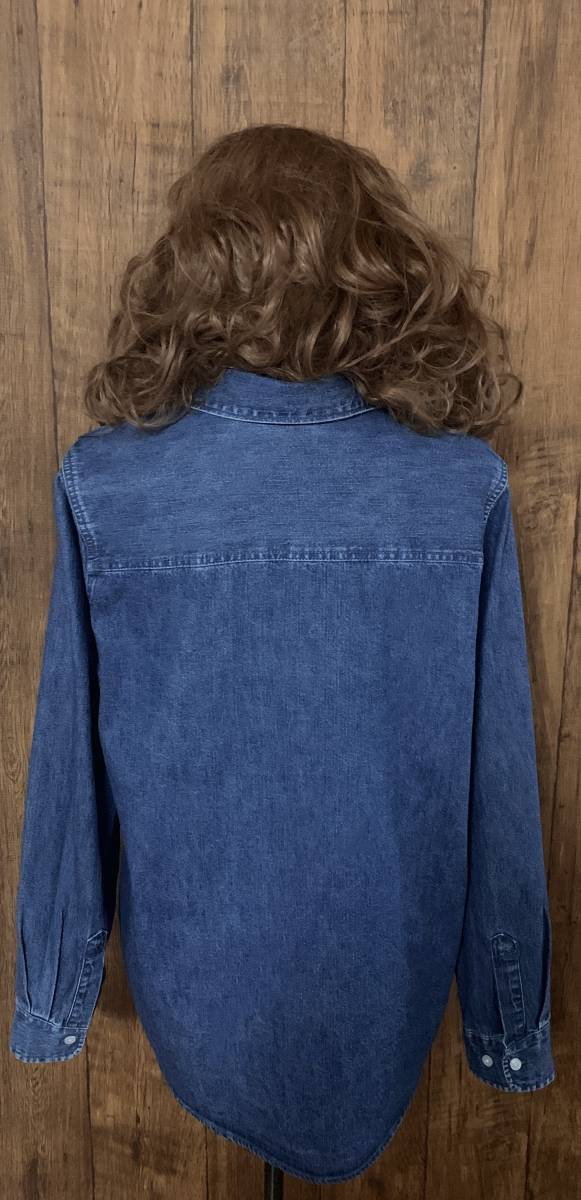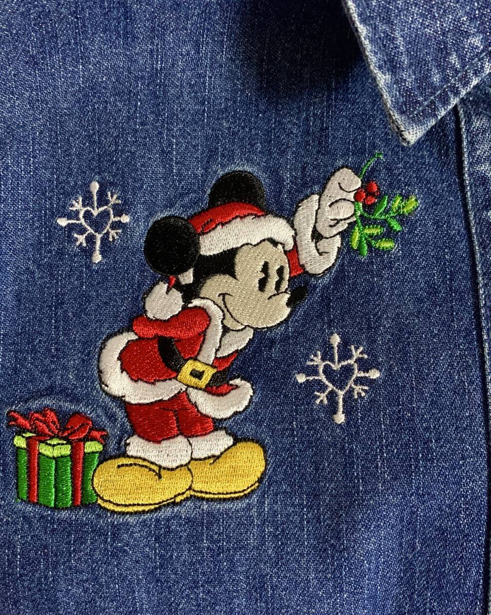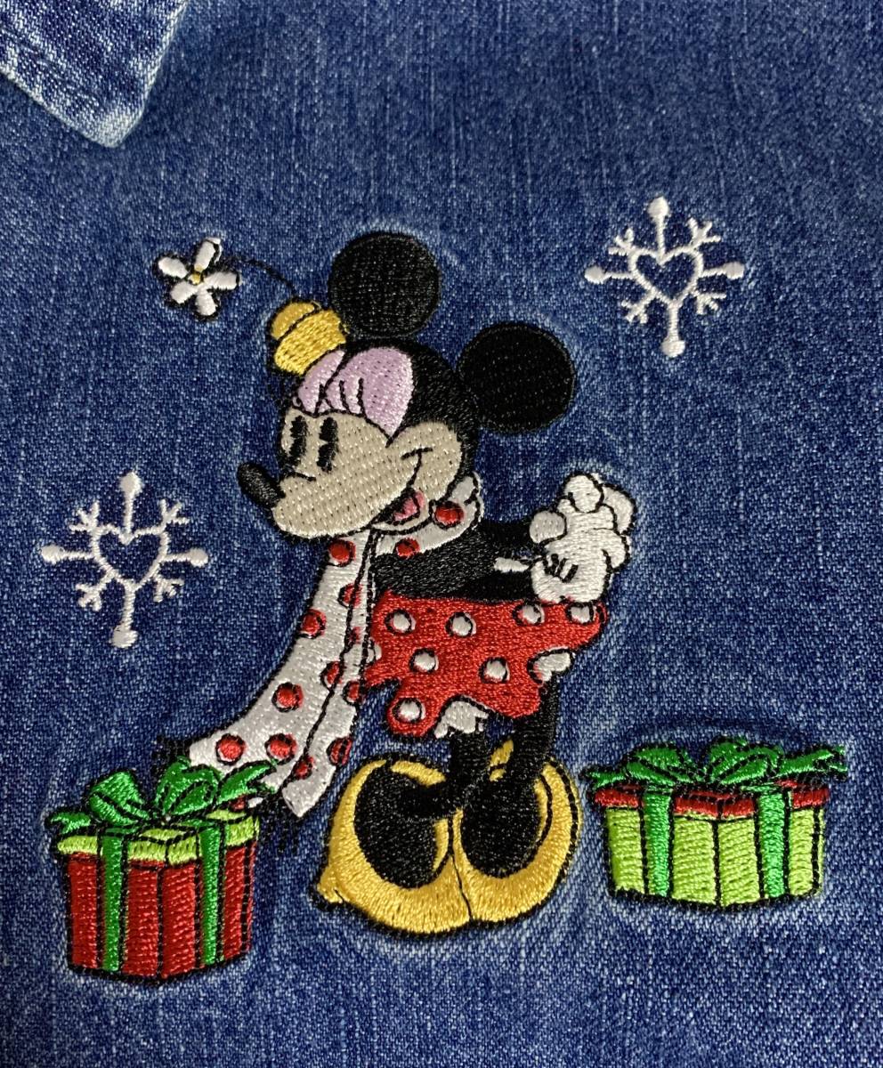大人気キャラクター・ミッキーとミニーの刺繍が胸元に施された大人かわいいデニムシャツ。