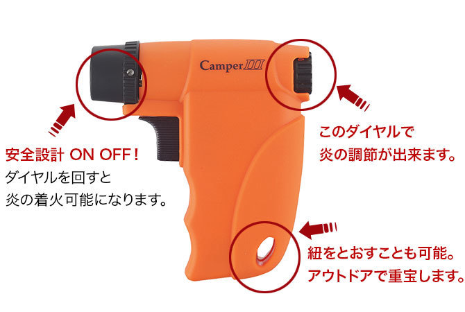 機能 | 安全ロックキャップ、火力調整ダイヤル 燃料ガス残量確認用スリット窓、 ストラップ通し穴 |