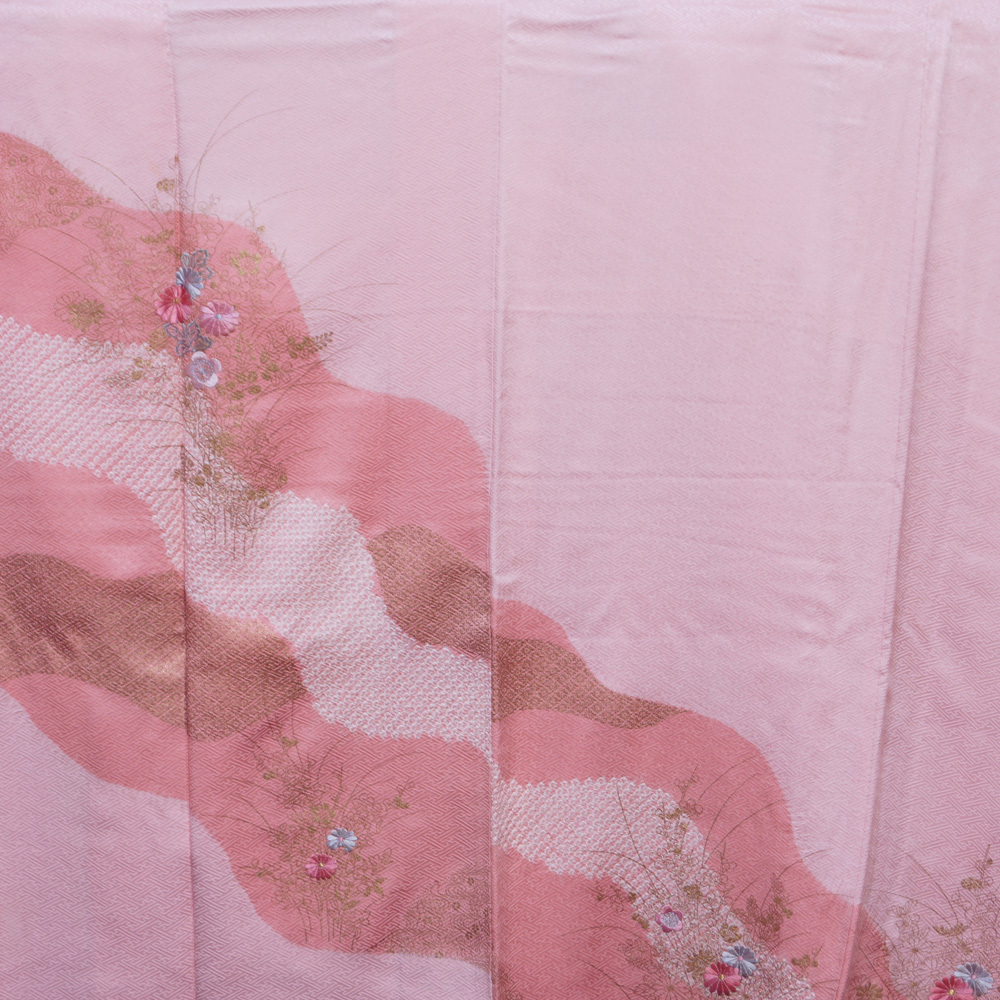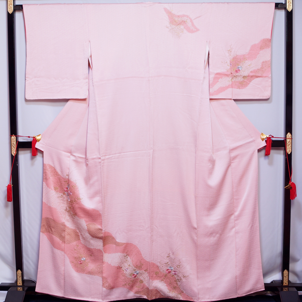 商品説明 | 薄ピンク色の地に道長に梅や菊などの枝花模様が染められた付下げ訪問着です。柄の一部には刺繍や絞りが施されています。 ※衿・袖・上前・八掛裾などに薄い着用汚れ、小さなシミが点在しています。全体に若干の使用感・経年感・色ヤケ感があります。 |