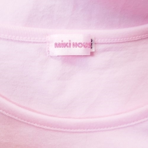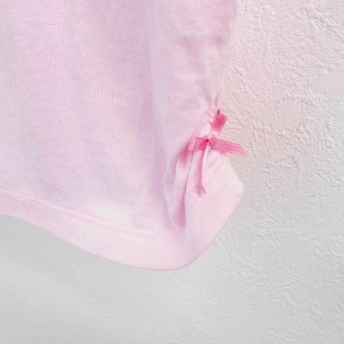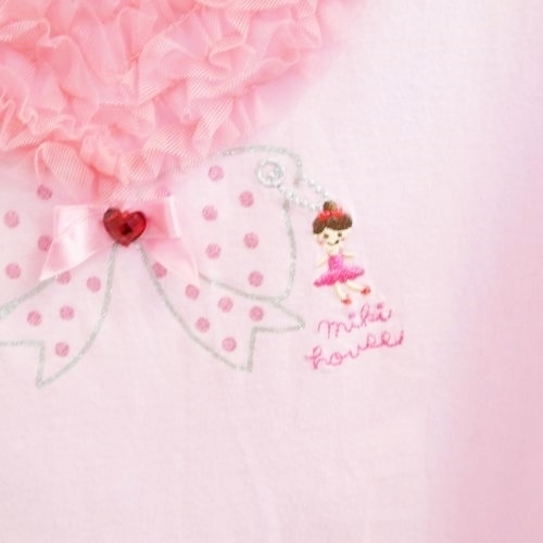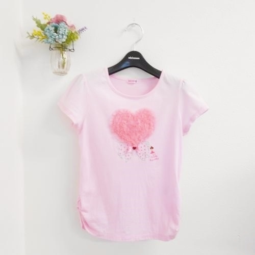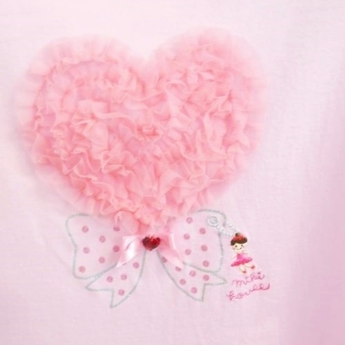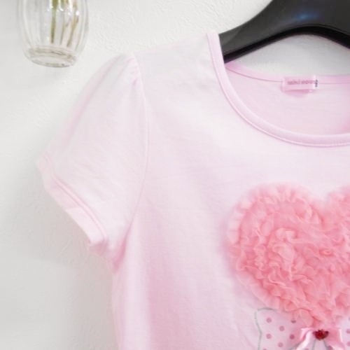 ミキハウス MIKIHOUSE 春夏に涼しい半袖カットソーTシャツです。ピンク地に前のハート型チュールが可愛い一品です。リボンやロゴ刺繍も入り豪華なトップスです。